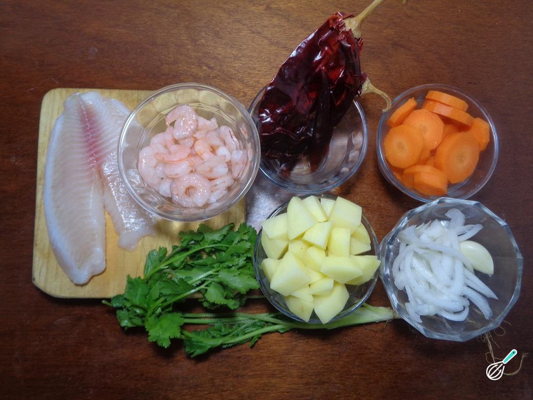 Coloque todos os ingredientes necessários para fazer o caldo de peixe com camarão em um balcão.