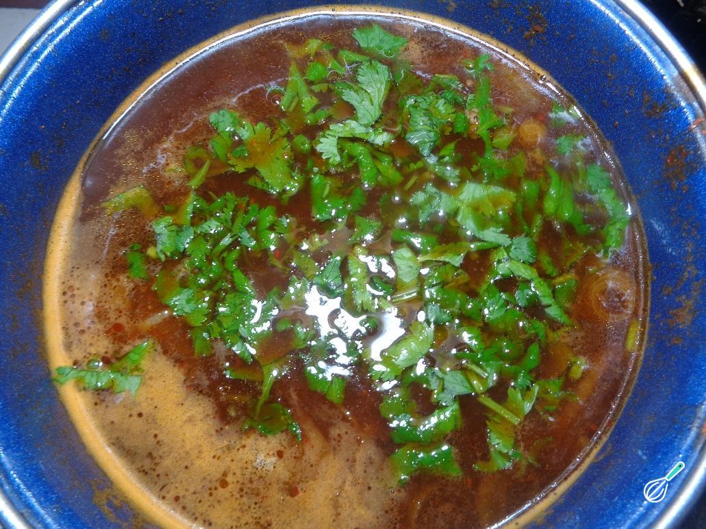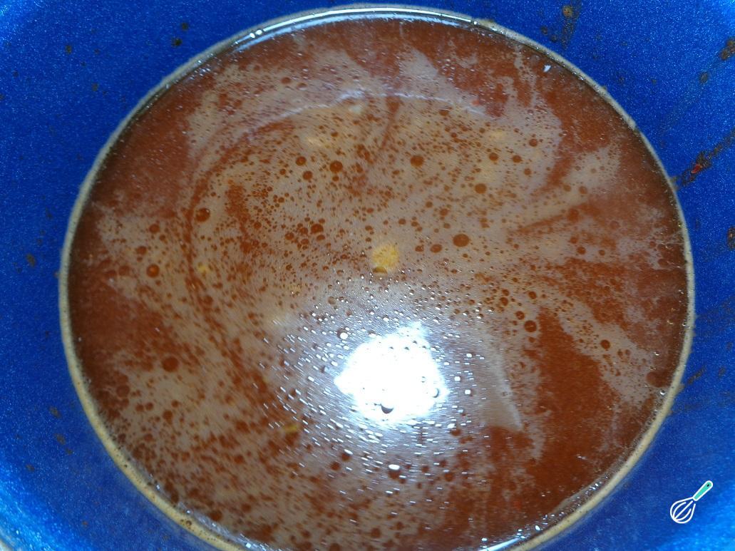Uma vez a cebola transparente, adicione o molho de pimenta do passo anterior e misture um pouco com a cebola. Use um coador para transferir a mistura para uma panela maior, coando enquanto o faz. Adicione bastante água à preparação e esse será o caldo base.