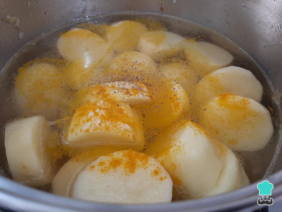 Cozinhe as batatas (em rodelas médias) com água (quantidade que cubra todas as batatas), sal e açafrão até que amoleçam. Reserve a água do cozimento.