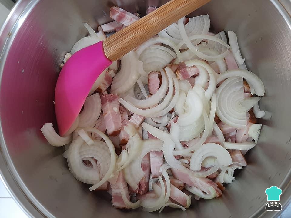 Numa panela funda aqueça o azeite de oliva e adicione o bacon e a cebola picada ou cortada em meia lua. Adicione o alho picado e deixe refogar até que o bacon esteja levemente dourado. Se desejar, descarte o excesso de gordura que se soltar do bacon.