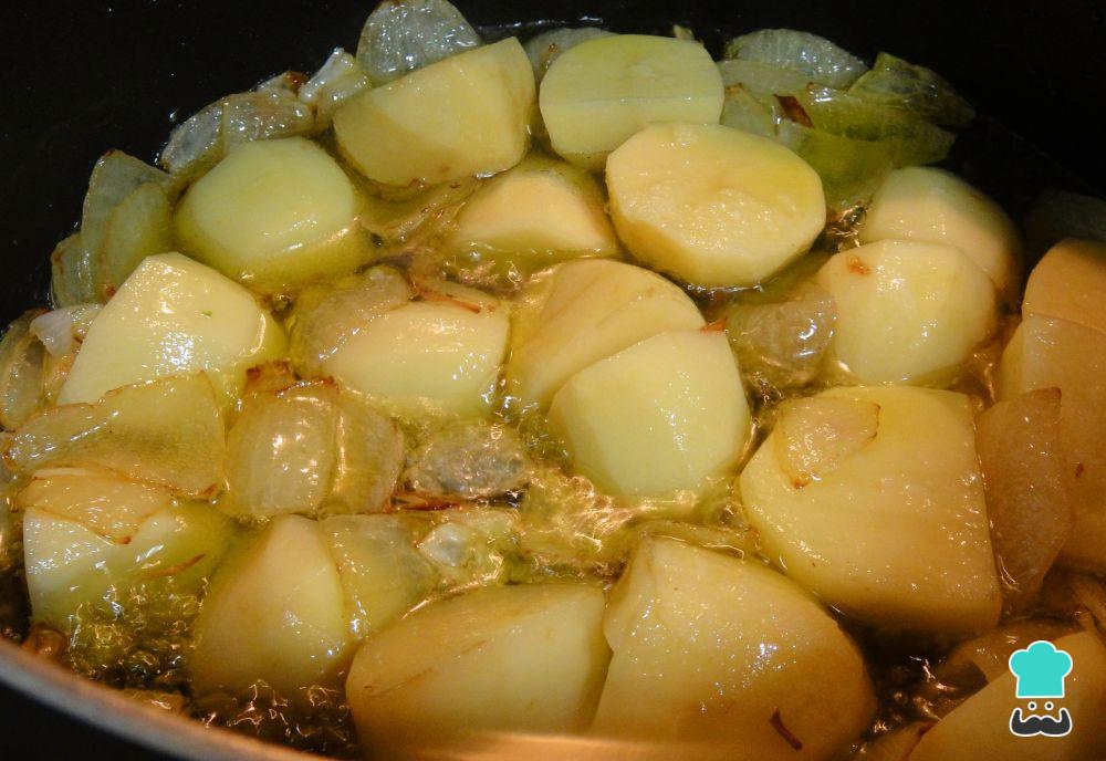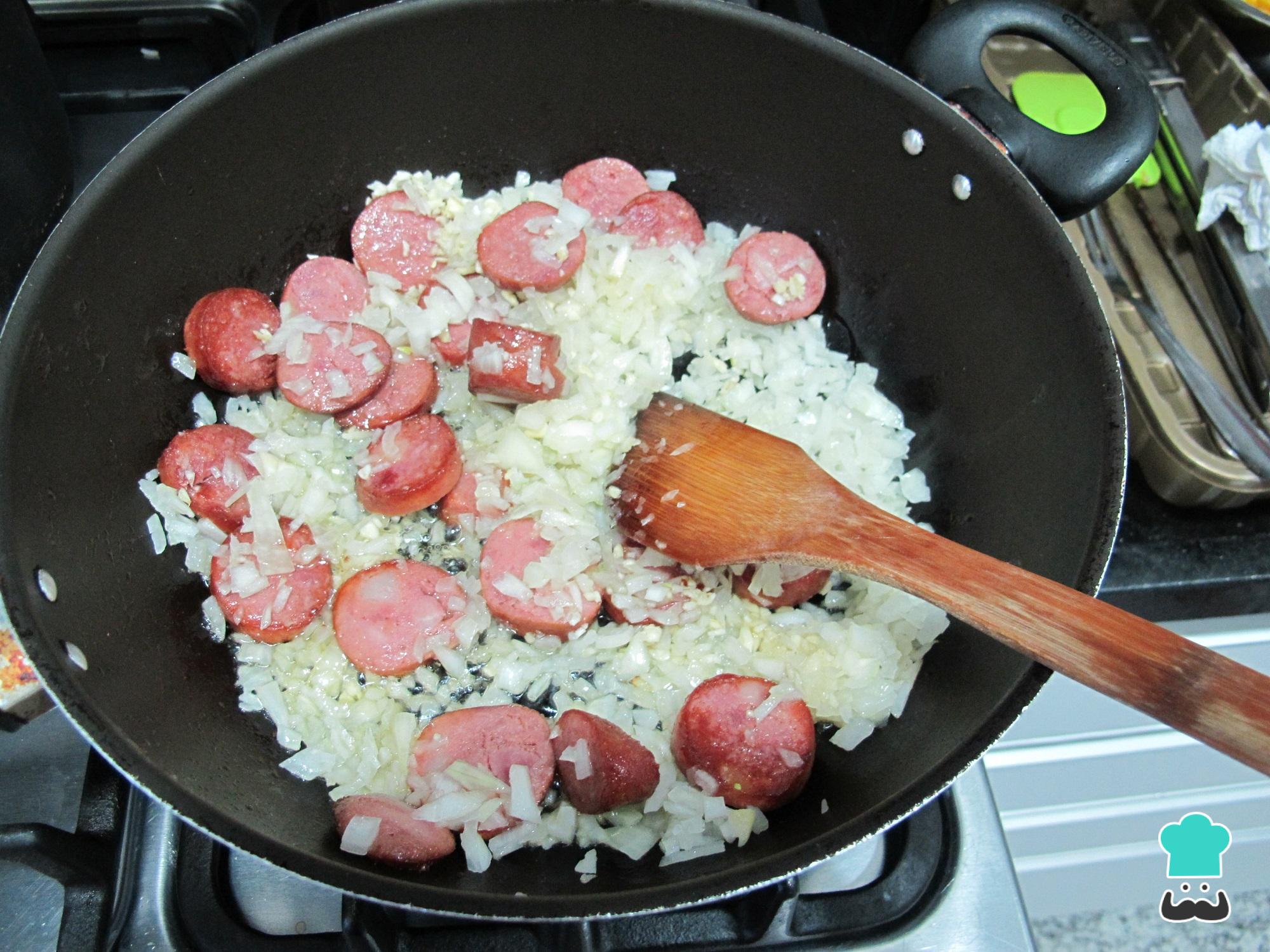 Leve ao fogo médio uma panela com a linguiça e deixe fritar. Depois acrescente o azeite, a cebola e os alhos, e refogue até dourar.