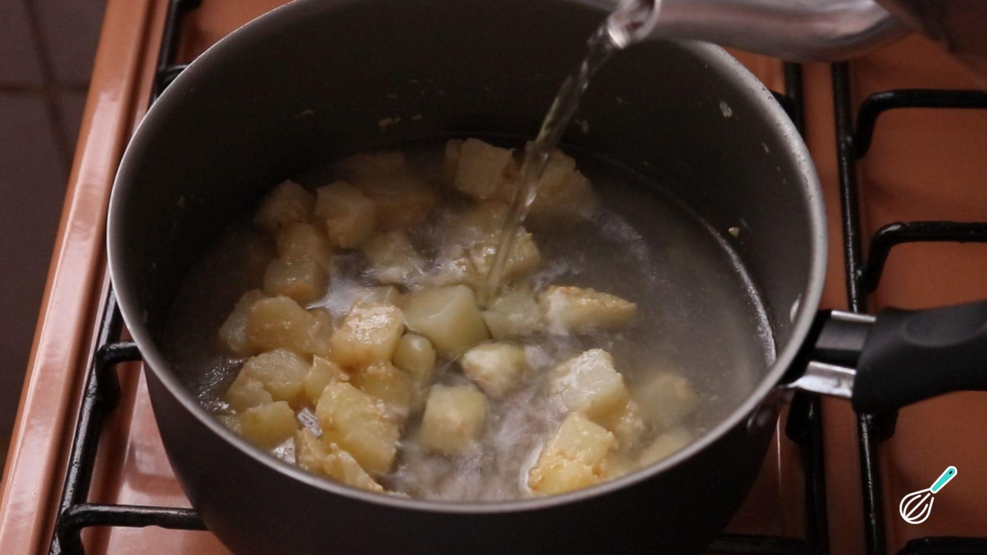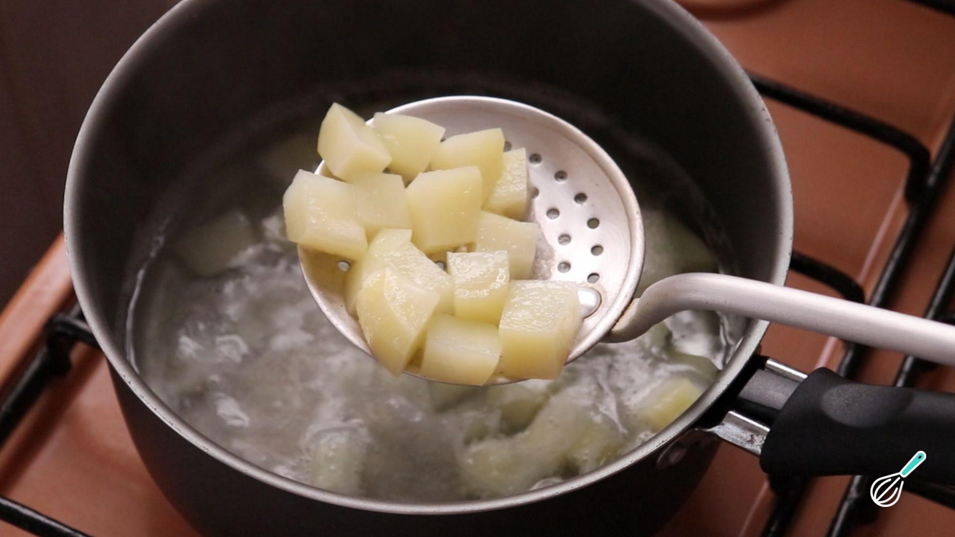 O primeiro passo para fazer o seu Caldo verde com couve, é cozinhar a batata cortada em cubos até que fique macia. Descarte a água e reserve.