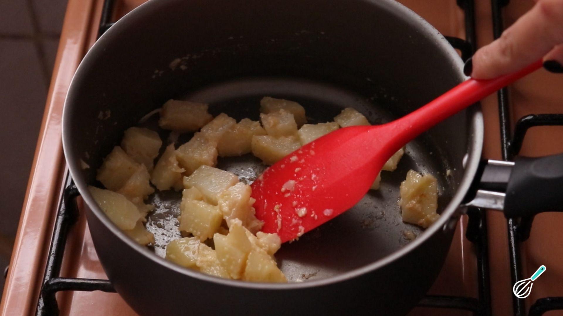 Volte a batata para a panela e mexa bem para que pegue o gosto do refogado.