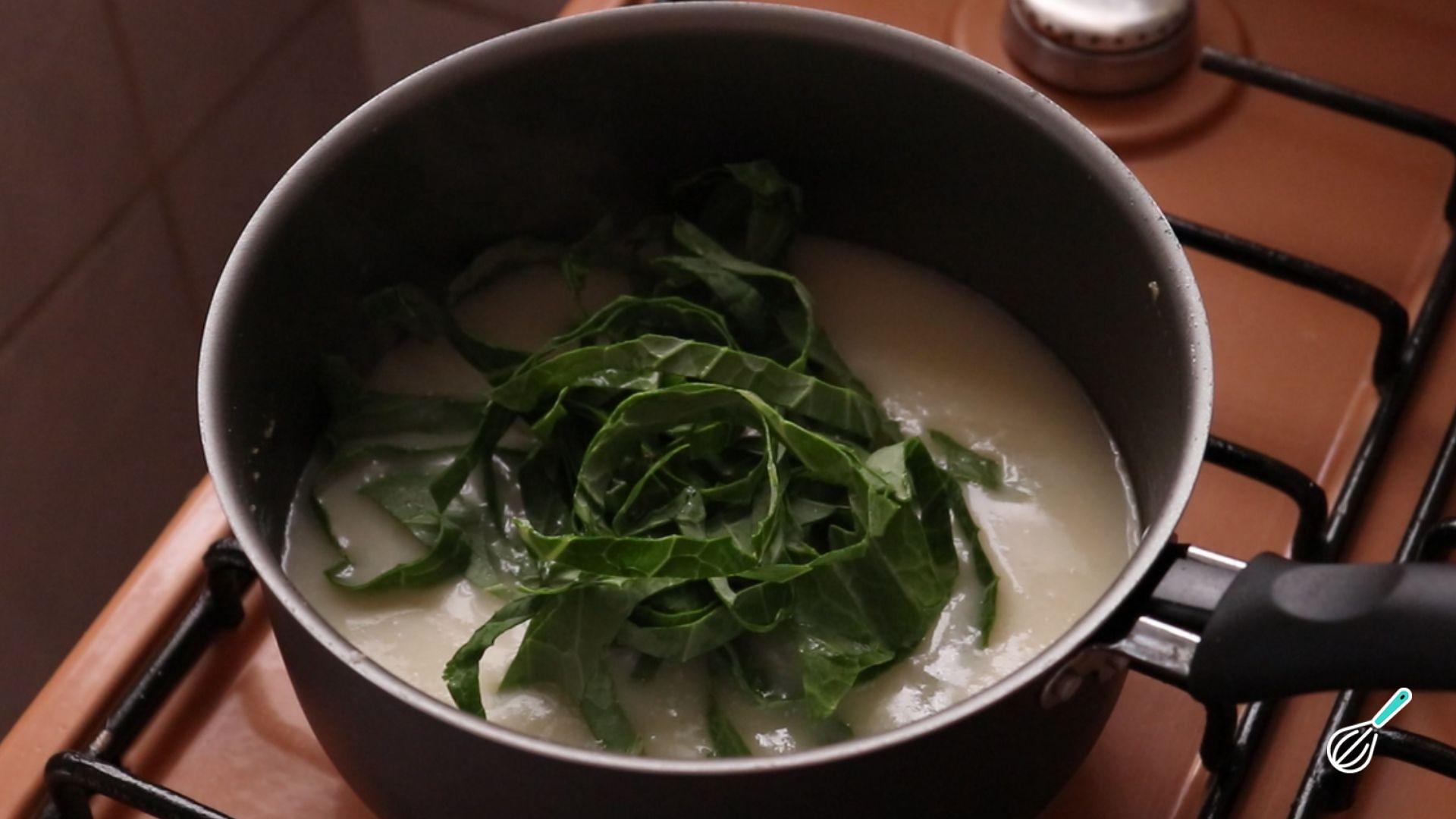 Despeje de volta na panela, junte a couve em tiras, tempere com sal e pimenta a gosto e cozinhe por mais 3 minutos.
