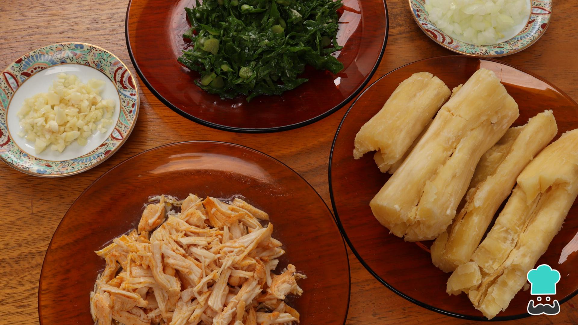 Tempere o frango da forma que desejar, cozinhe na panela de pressão com 2 xícaras de água e desfie. Cozinhe a mandioca também na panela de pressão com 4 xícaras de água e reserve. Já a couve você refoga na manteiga e uma pitada de sal até murchar. A cebola e o alho devem ser picados.