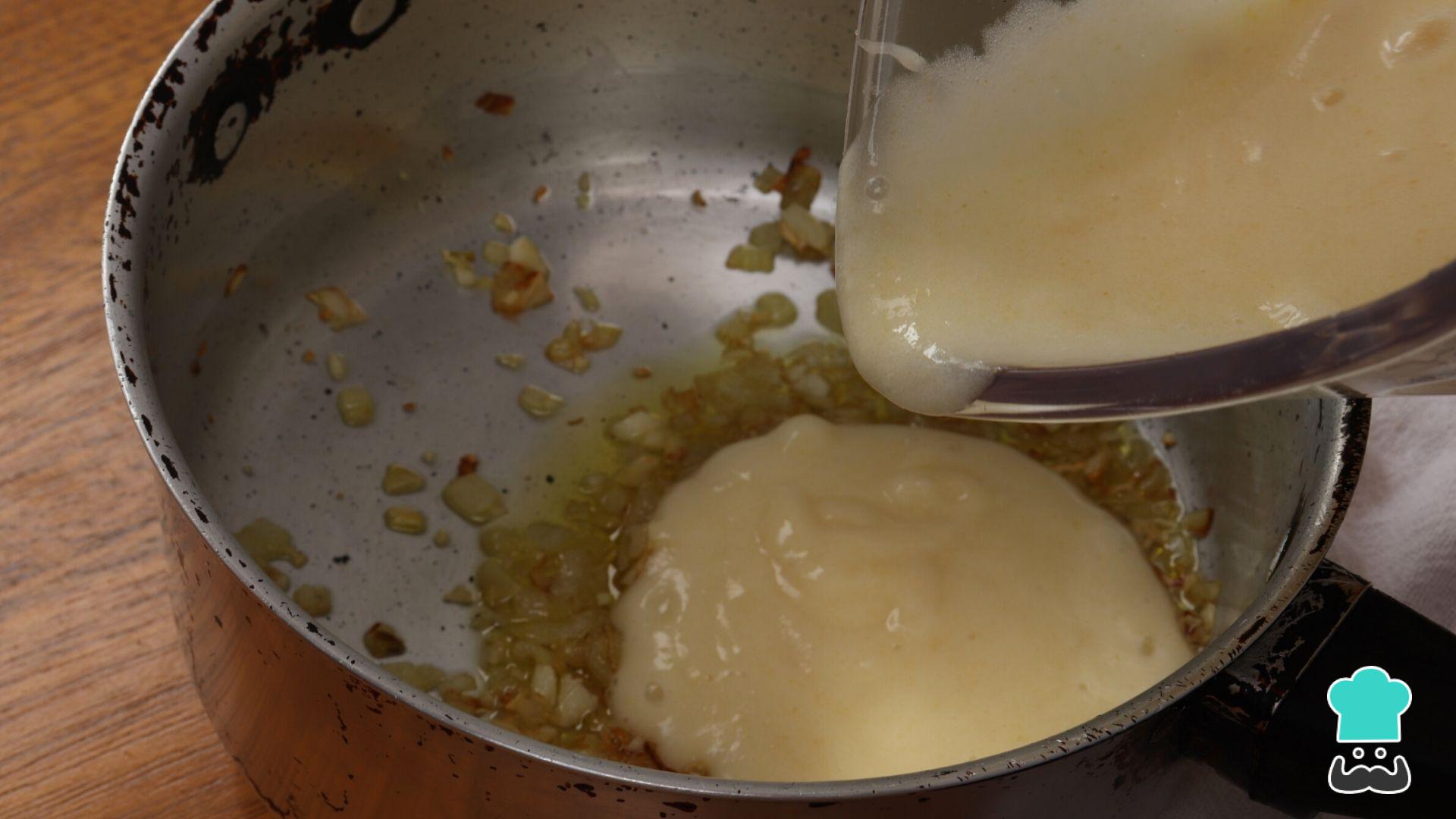 Em uma panela funda doure a cebola e o alho no azeite e, em seguida, acrescente a mandioca batida.