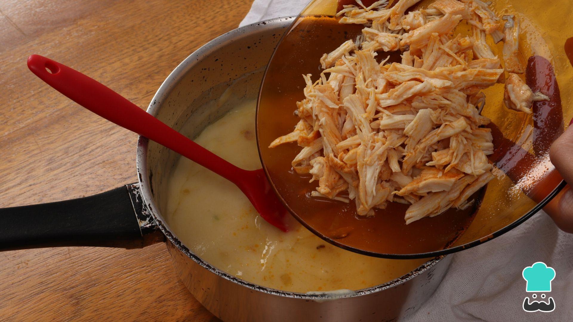 O passo seguinte desta receita de caldo verde caseiro é colocar o frango desfiado cozido.
