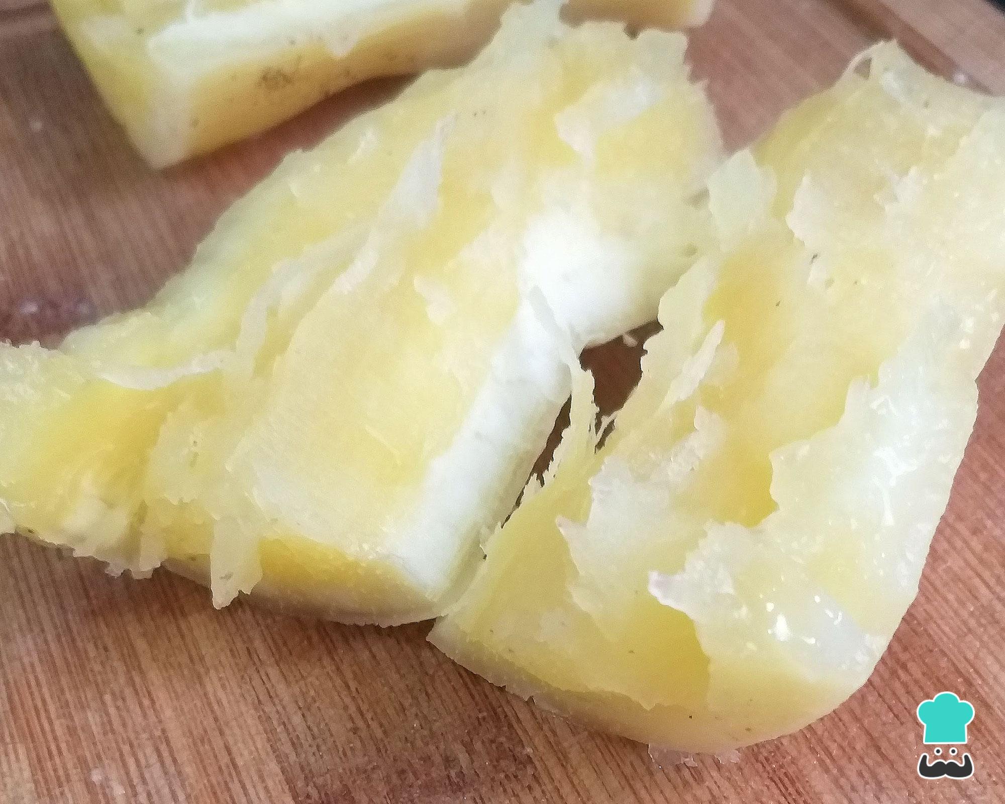 É bem simples preparar este caldo com mandioca! Comece por cozinhar a mandioca na pressão com 1 litro de água por 20-30 minutos (contando depois de pegar pressão). No fim desse tempo desligue o fogo, espere a pressão sair e retire as mandiocas. Abra as mandiocas na metade e retire a parte fibrosa do meio.