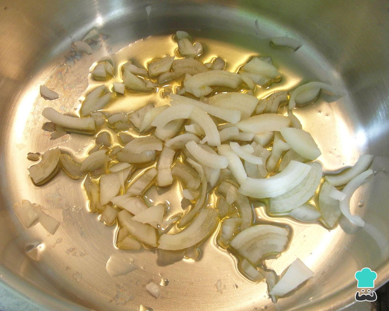 Numa outra panela refogue a cebola, os alhos e a calabresa no azeite ou óleo, mexendo para evitar queimar. Quando a cebola estiver macia, adicione o caldo batido no liquidificador e também a couve cortadinha.