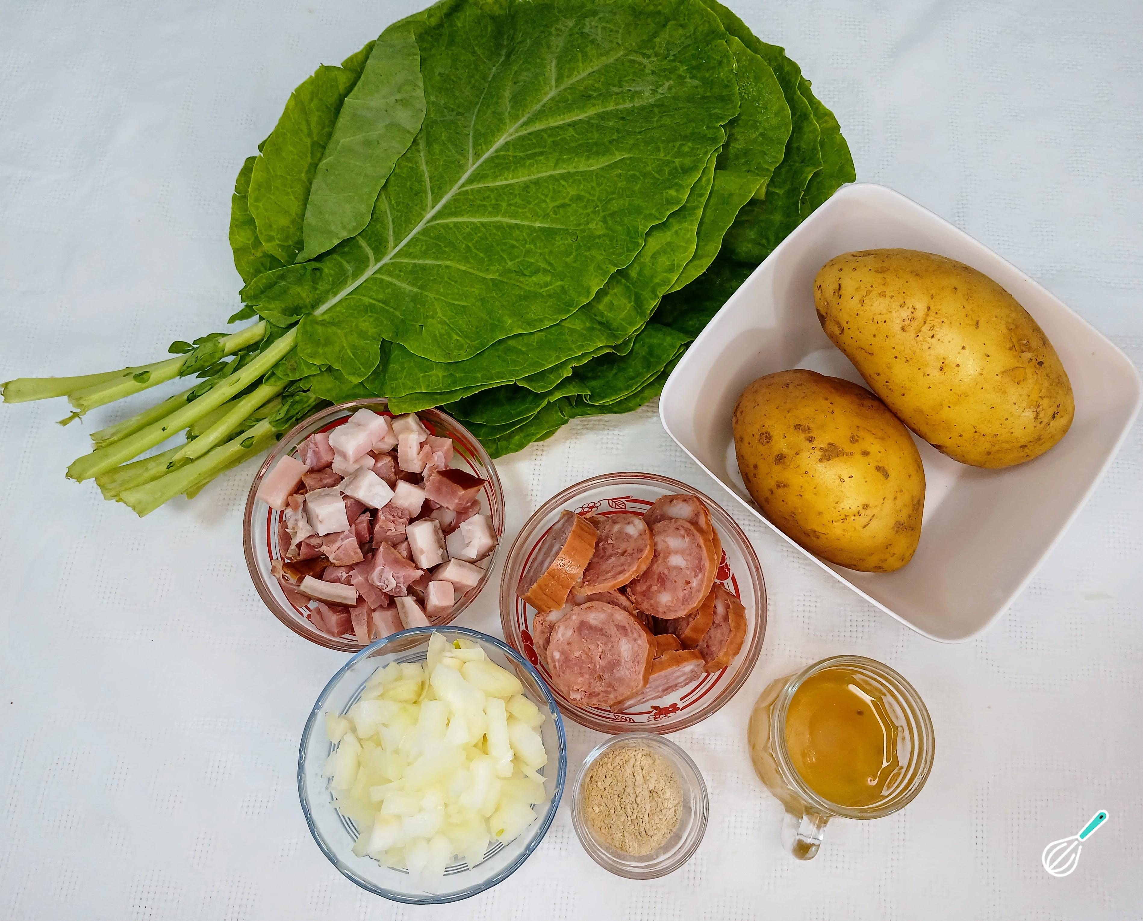 Comece separando os ingredientes para o preparo do caldo verde legítimo. Separe a couve, as batatas, a linguiça portuguesa ou calabresa. Separe os temperos que serão usados no preparo do caldo verde. Separe sal e pimenta.