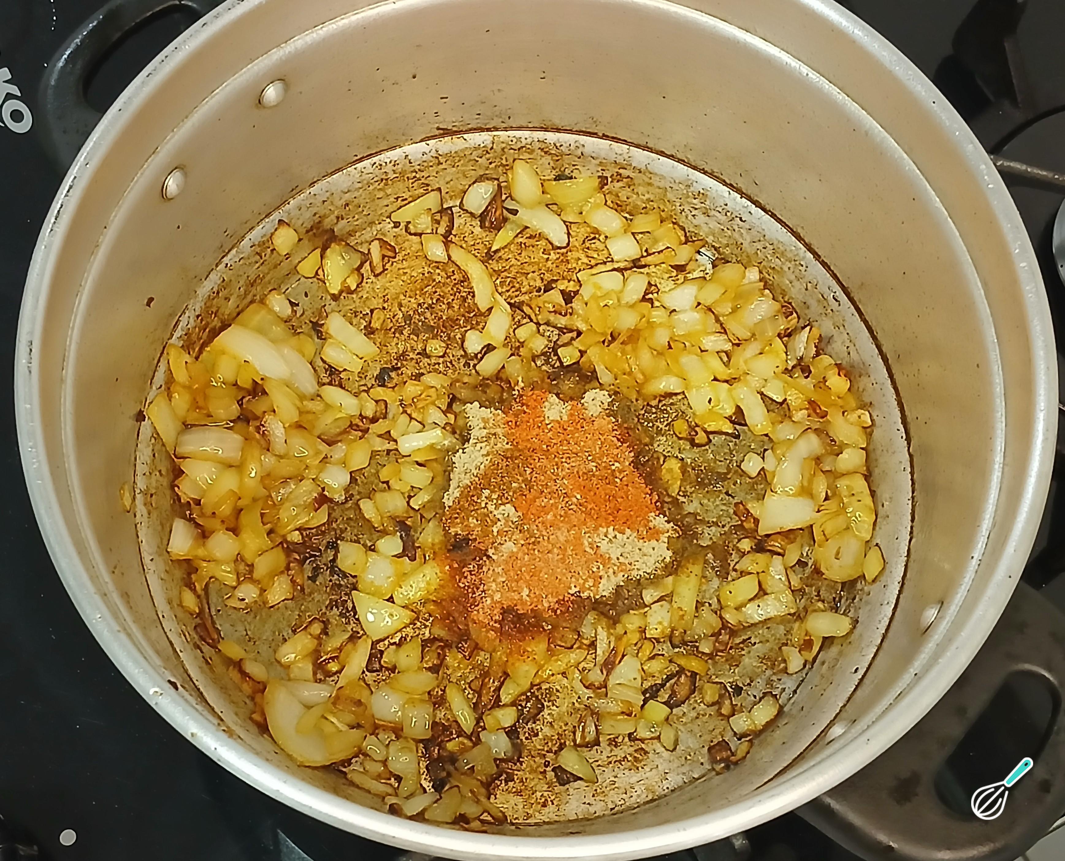 Refogue bem e em seguida adicione os temperos na cebola, mexa bem para incorporar o sabor. Desligue e reserve.