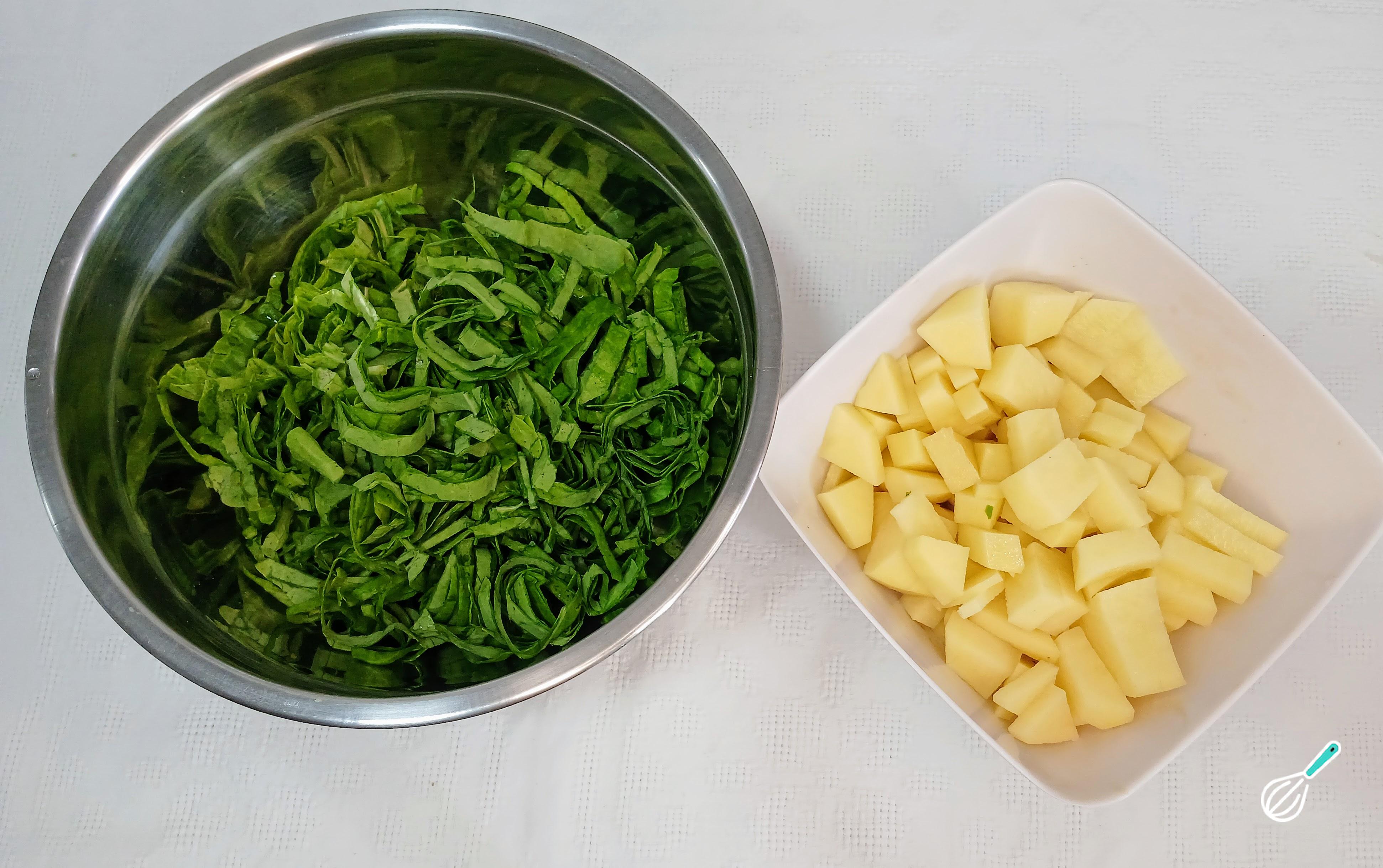 Descasque as batatas e corte-as em cubos. O maço de couve corte bem finhinha.