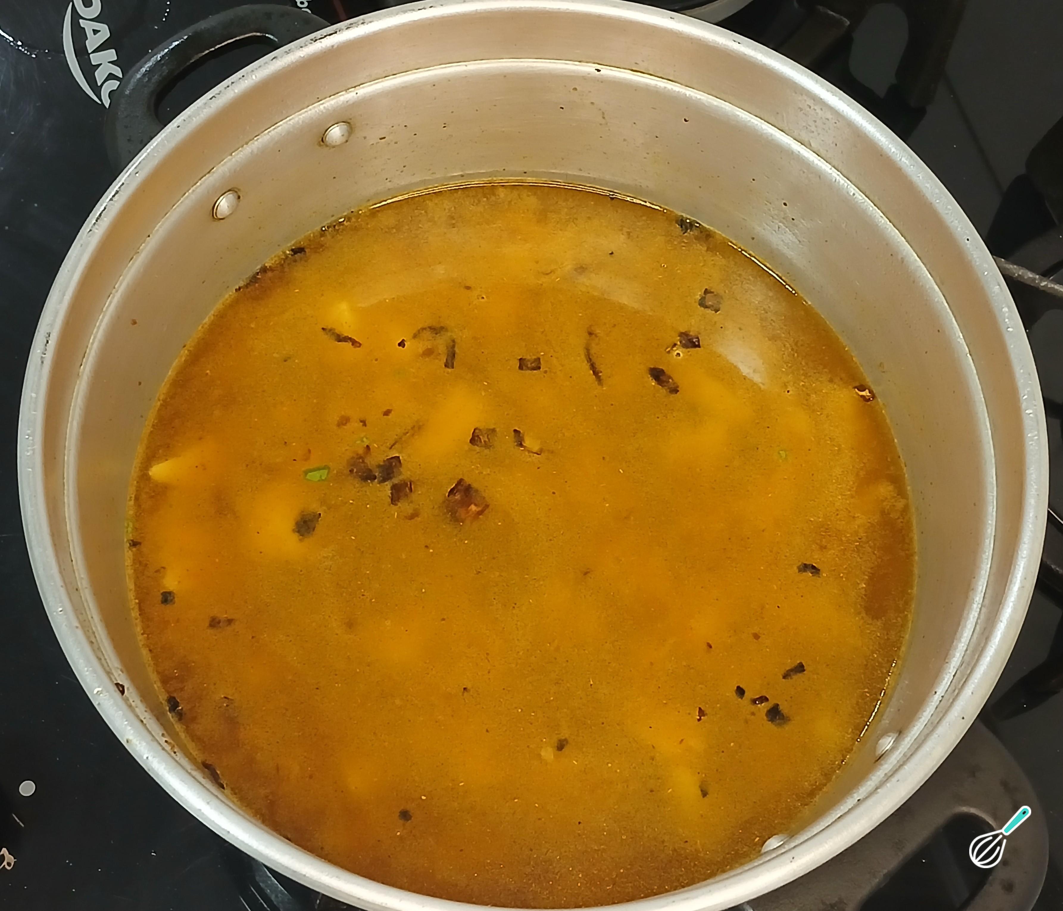 Na panela com cebola, adicione as batatas cortadas e refogue bem. Depois de refogar, cubra as batatas com água e deixe cozinhar até que fiquem macias.