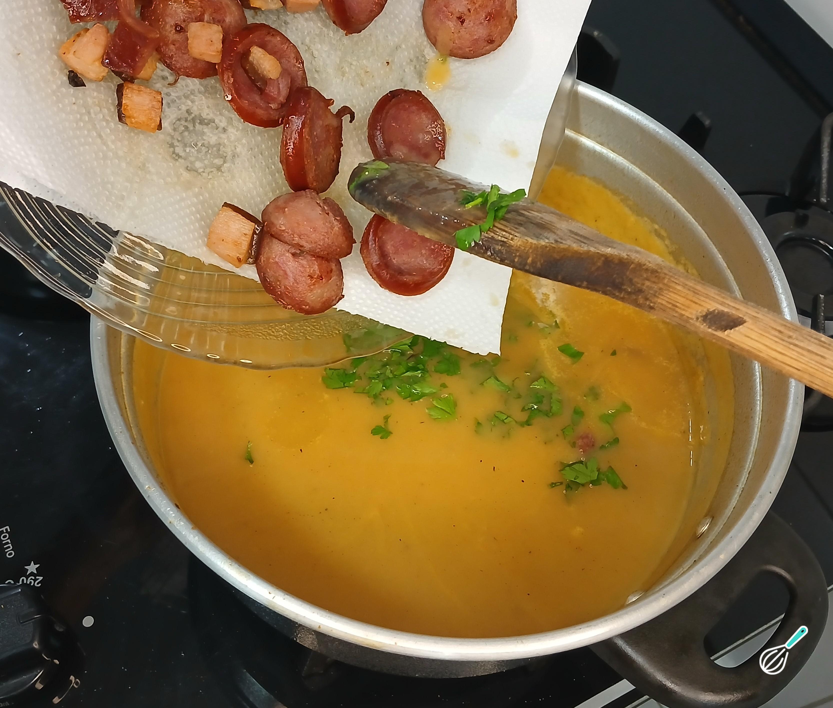 Depois de bater, transfira novamente para a panela e deixe cozinhar em pouco. Adicione as linguiças, o bacon a cebolinha verde, prove e acerte sal.