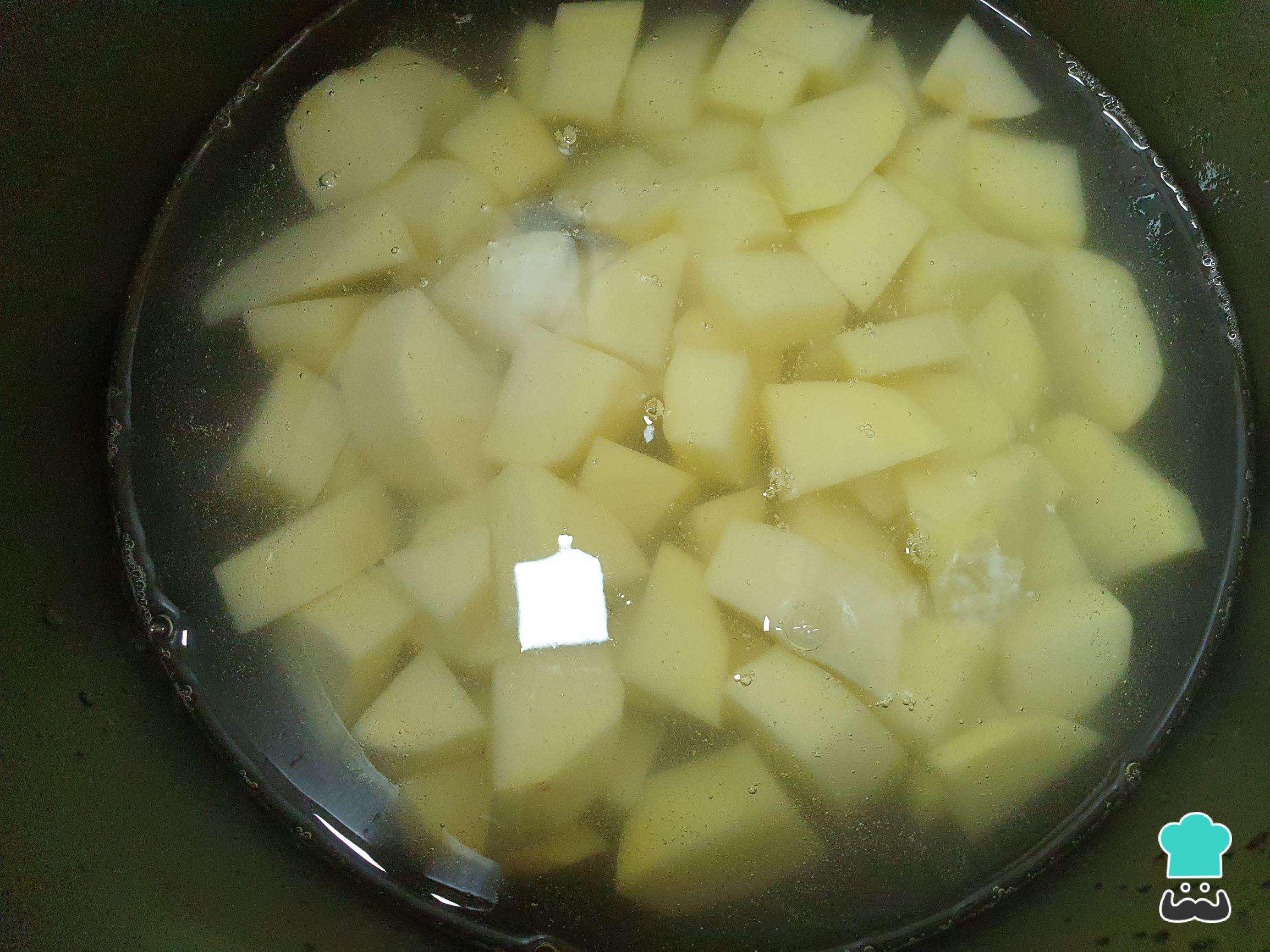 Leve a batata para cozinhar até que fique bem macia, com a água e com sal.