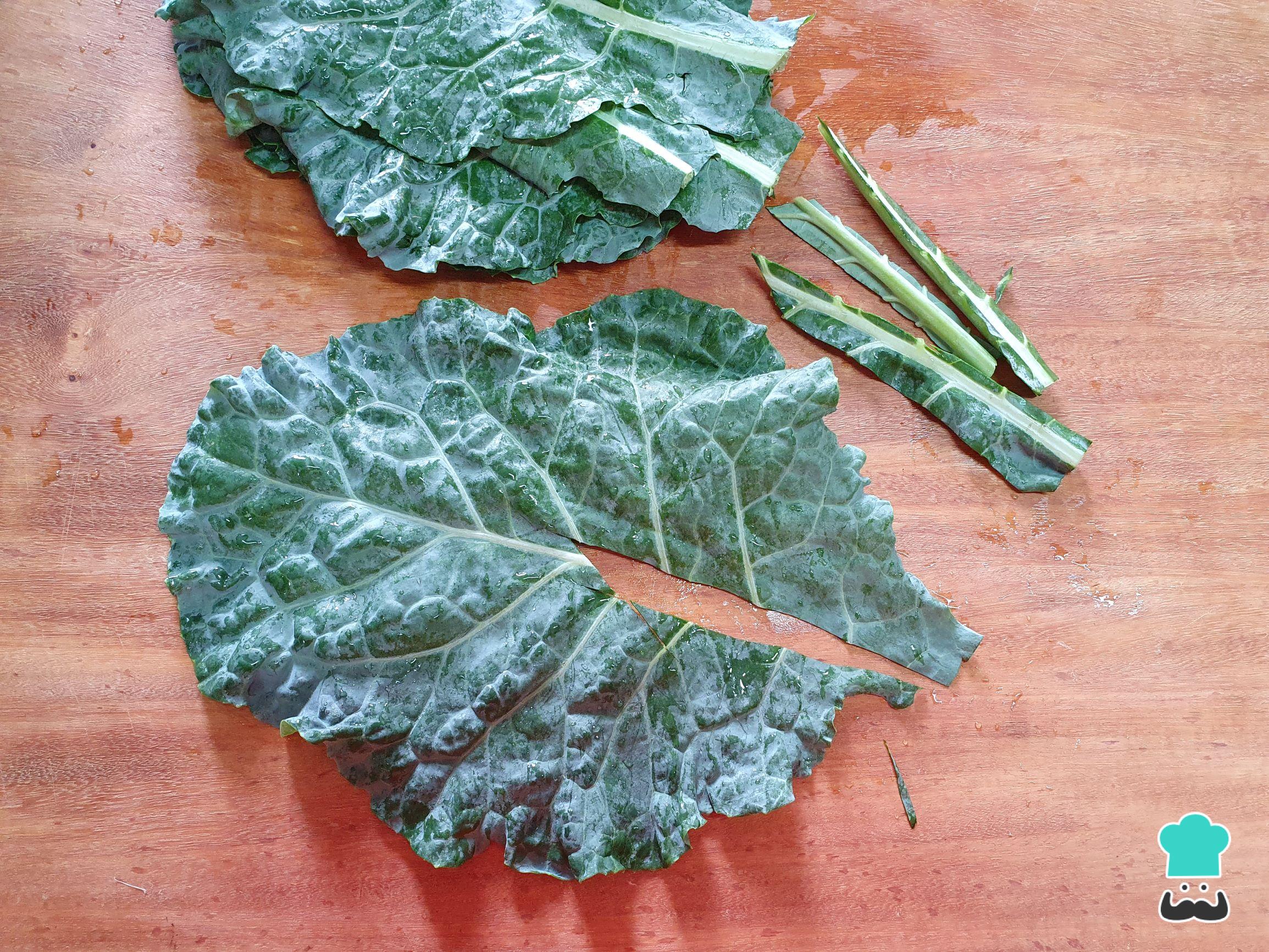 Enquanto a batata cozinha, retire os talos mais grossos da couve. Faça cortes em torno do talo mais grosso e o remova. Não descarte, ele é rico em nutrientes, iremos aproveitar a couve integralmente.