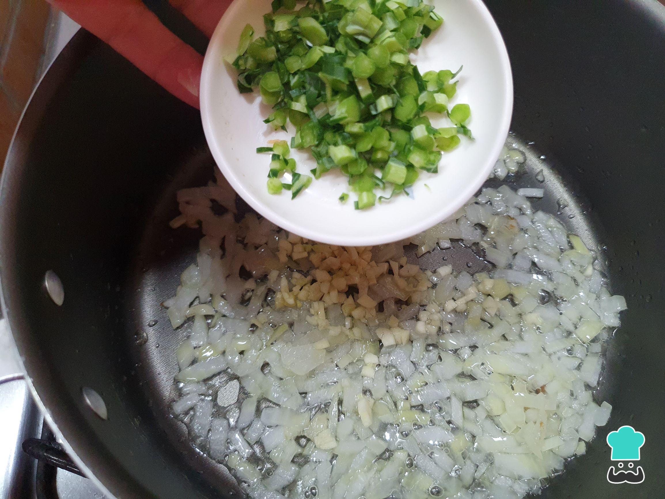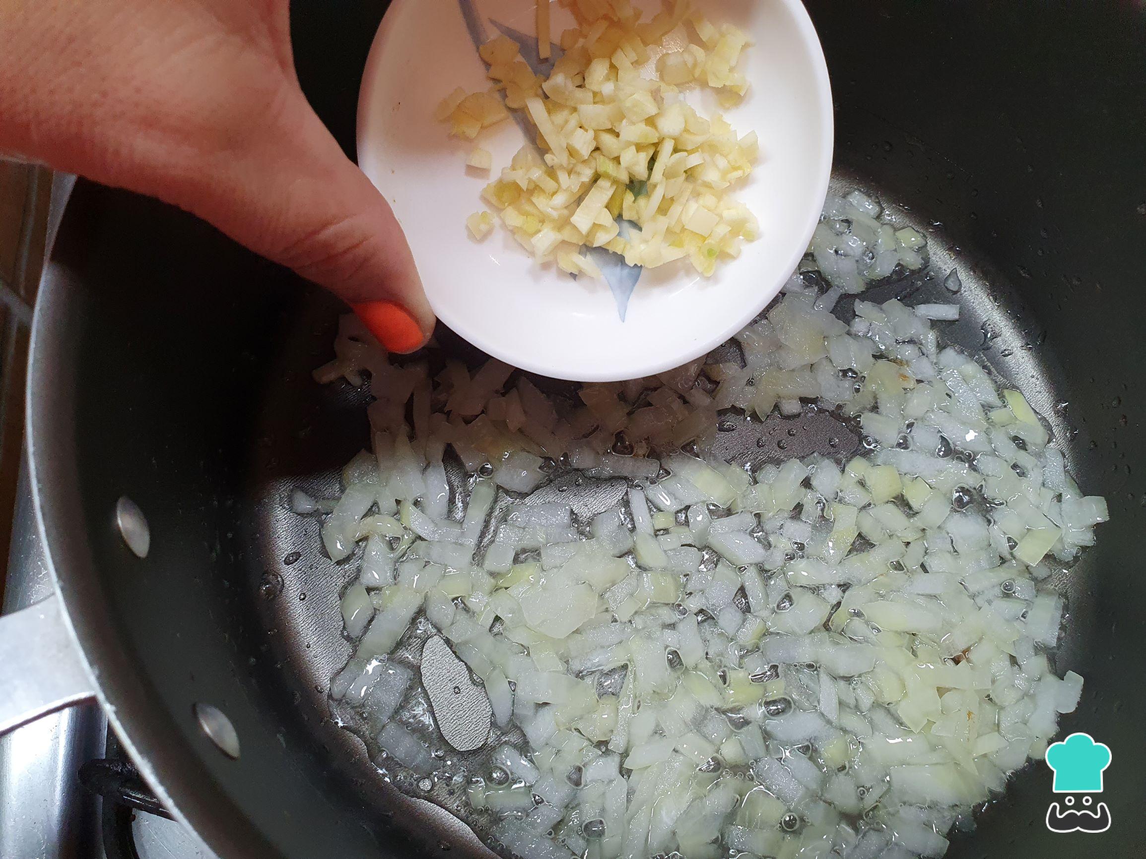 Em uma panela, aqueça o azeite e refogue a cebola até ficar transparente, junte o alho e refogue bem.