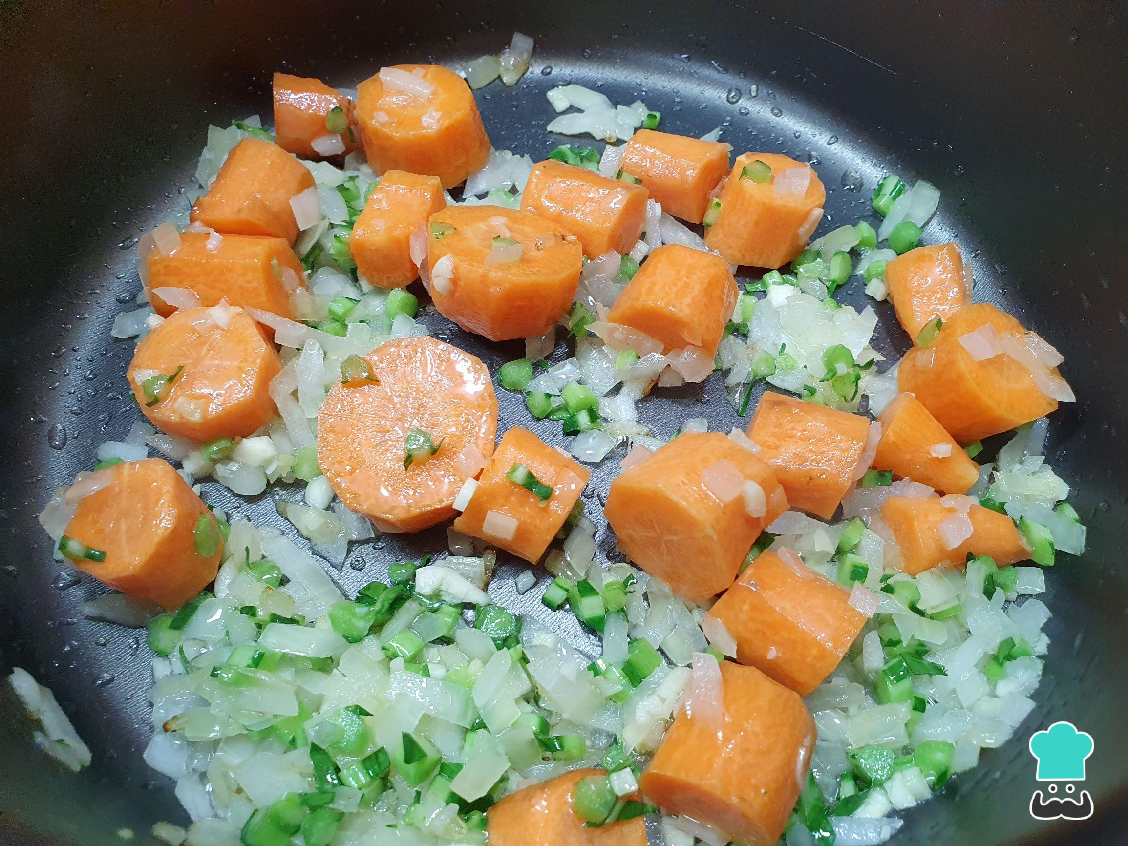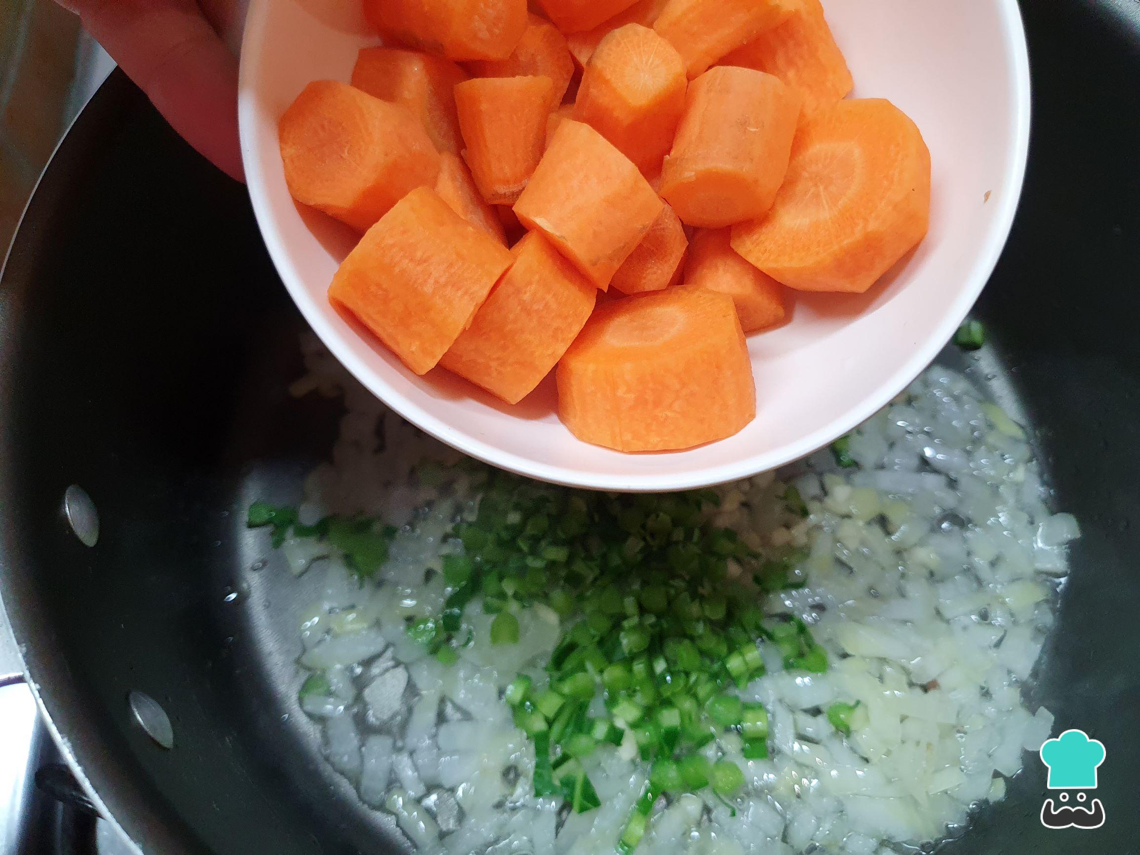 Enquanto a cebola, o alho e os talinhos de couve refogam, junte as cenouras.