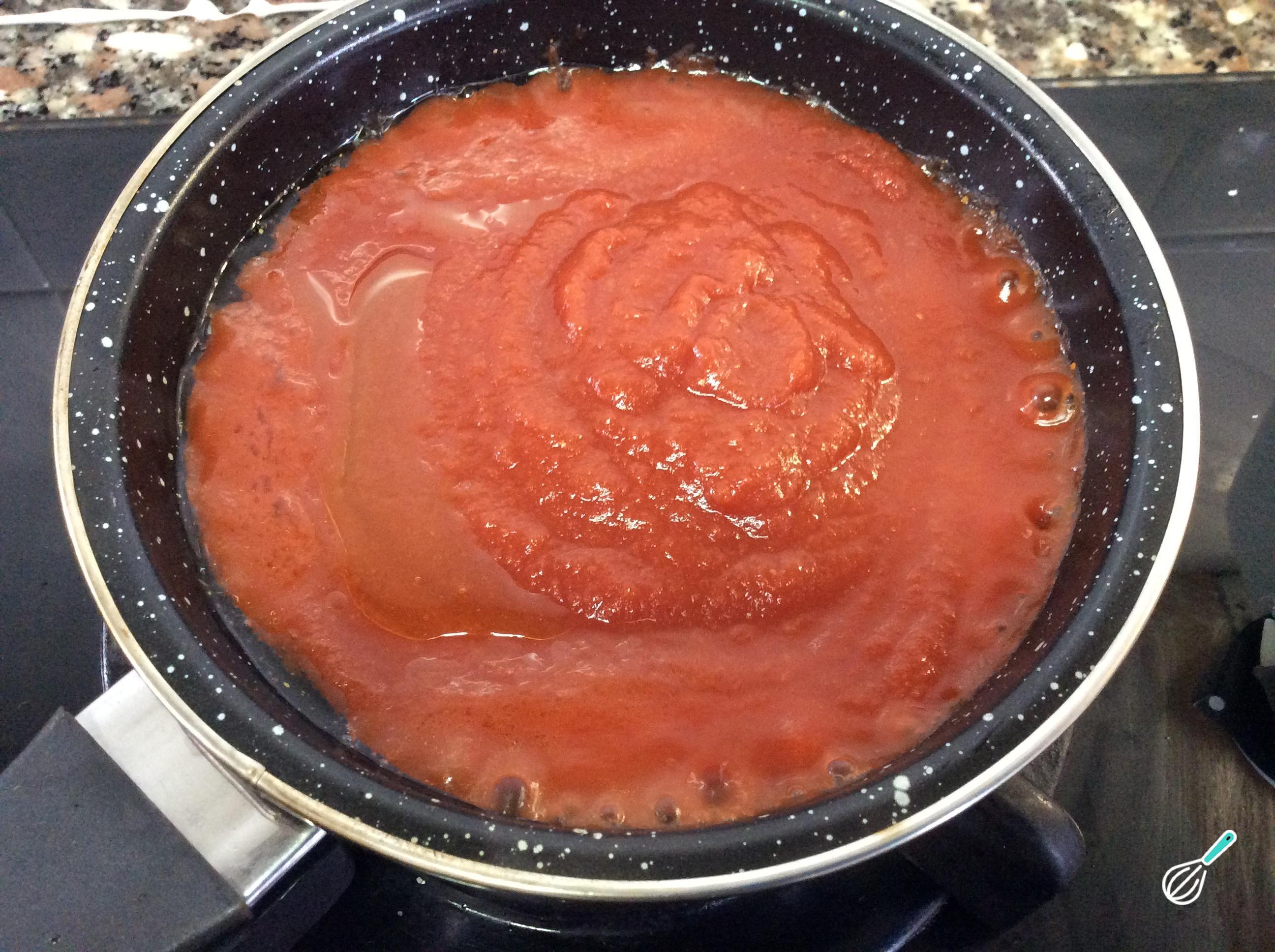 O primeiro passo para fazer este calzone caseiro é esquentar o molho de tomate em uma frigideira com um pouco de azeite. Caso não seja um molho temperado, aproveite para adicionar sal e oréganos.