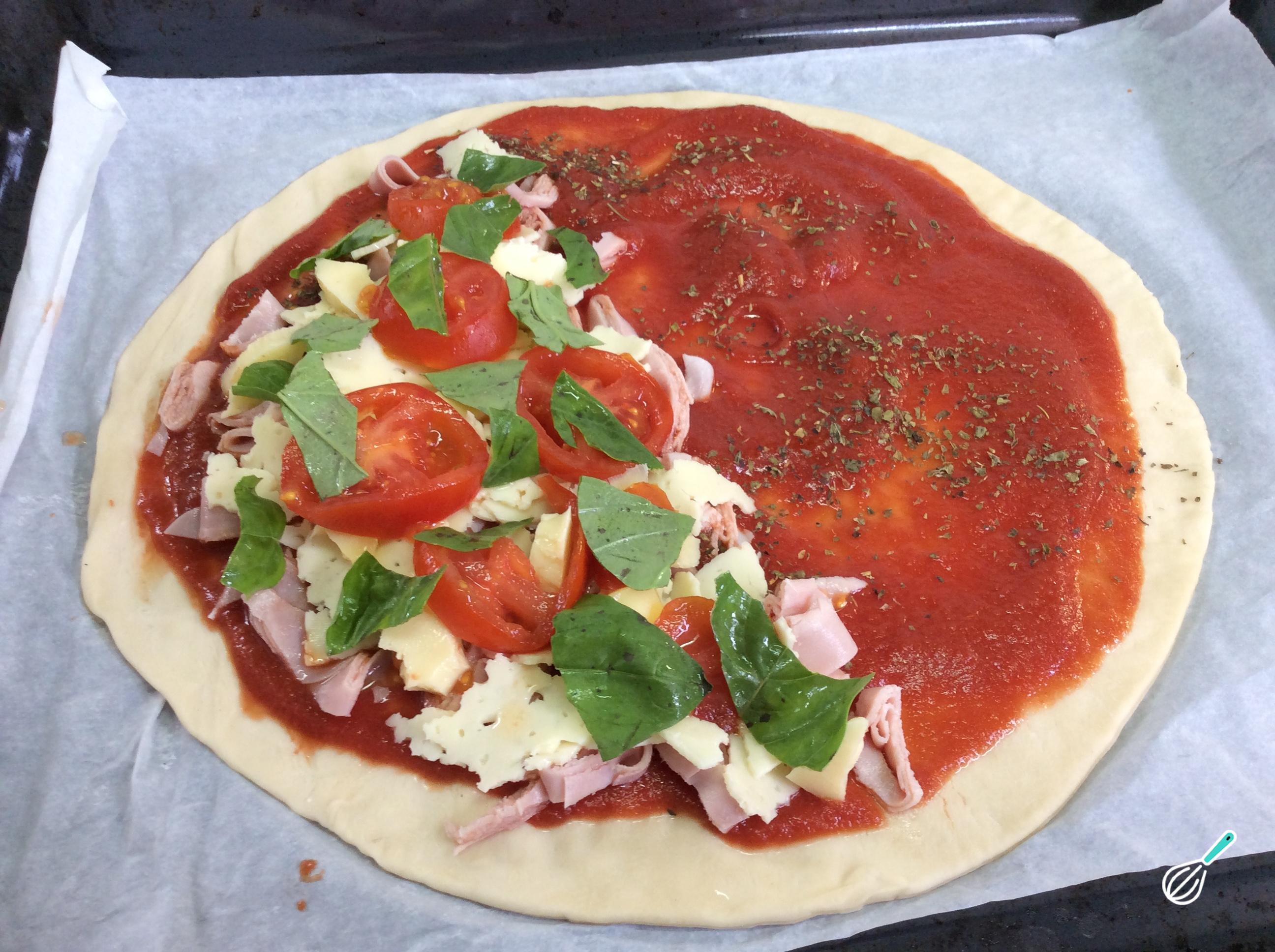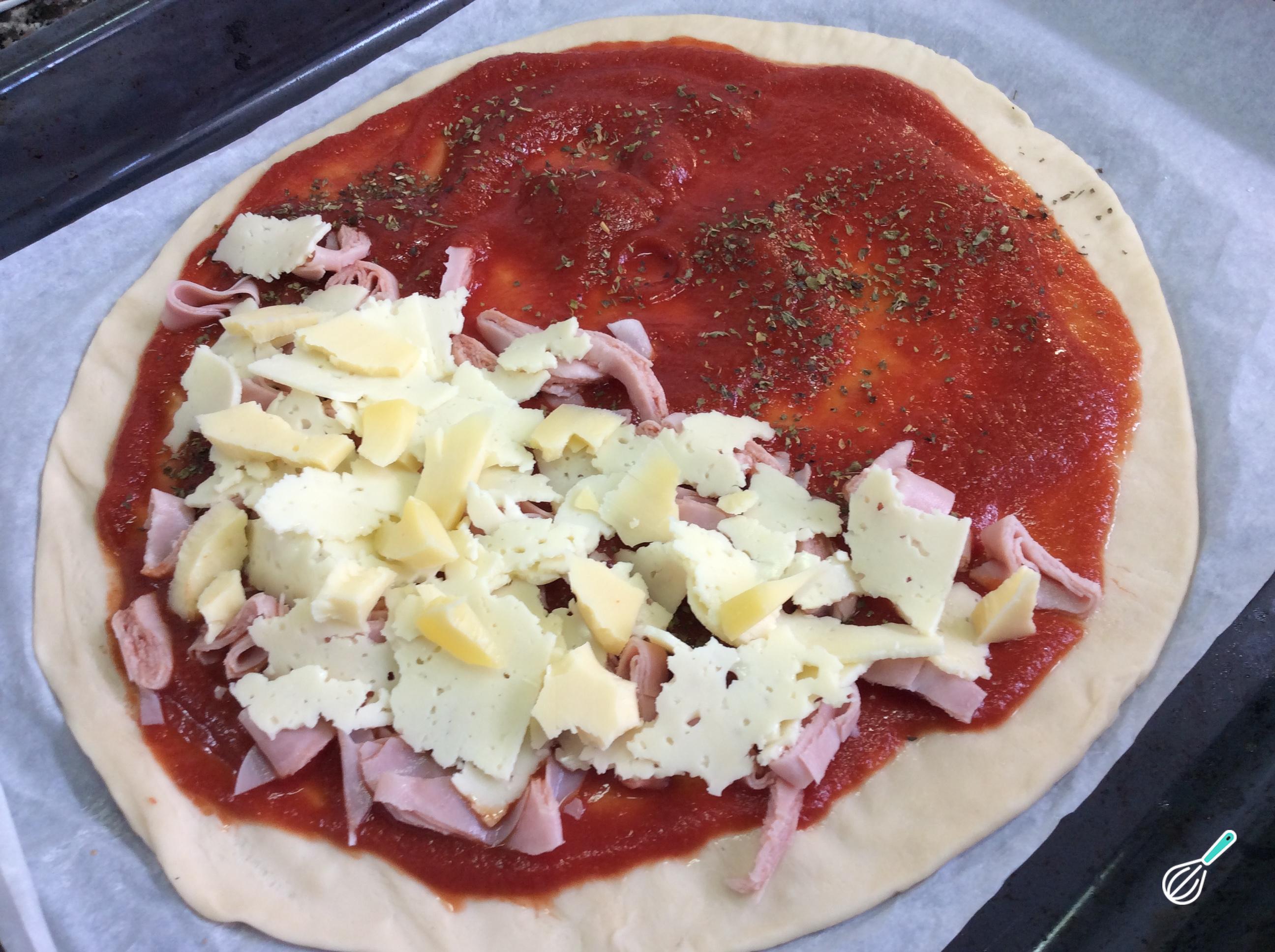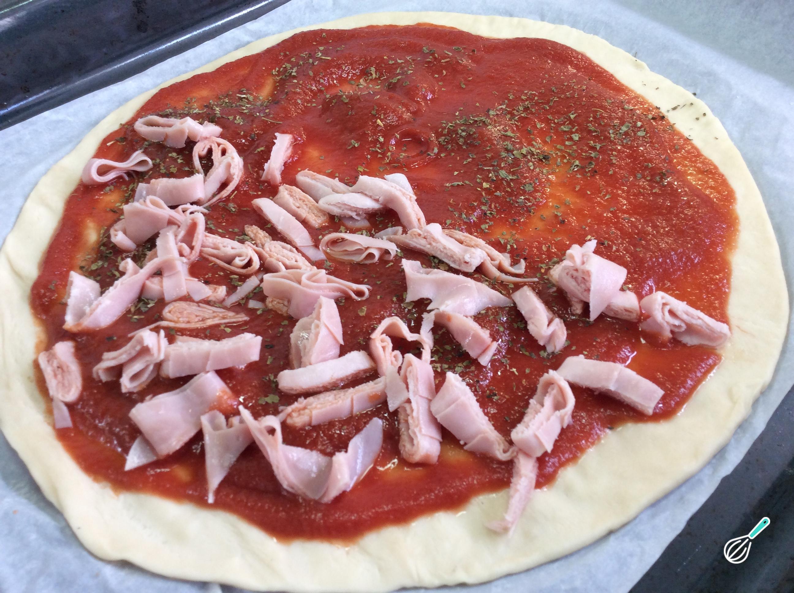 Em seguida espalhe o molho sobre a massa de pizza, já aberta em um tabuleiro de forno com papel manteiga. O calzone italiano é uma pizza que é dobrada sobre si mesma, por isso adicione os ingredientes apenas numa das metades, começando pelo presunto cortado em pedaços.