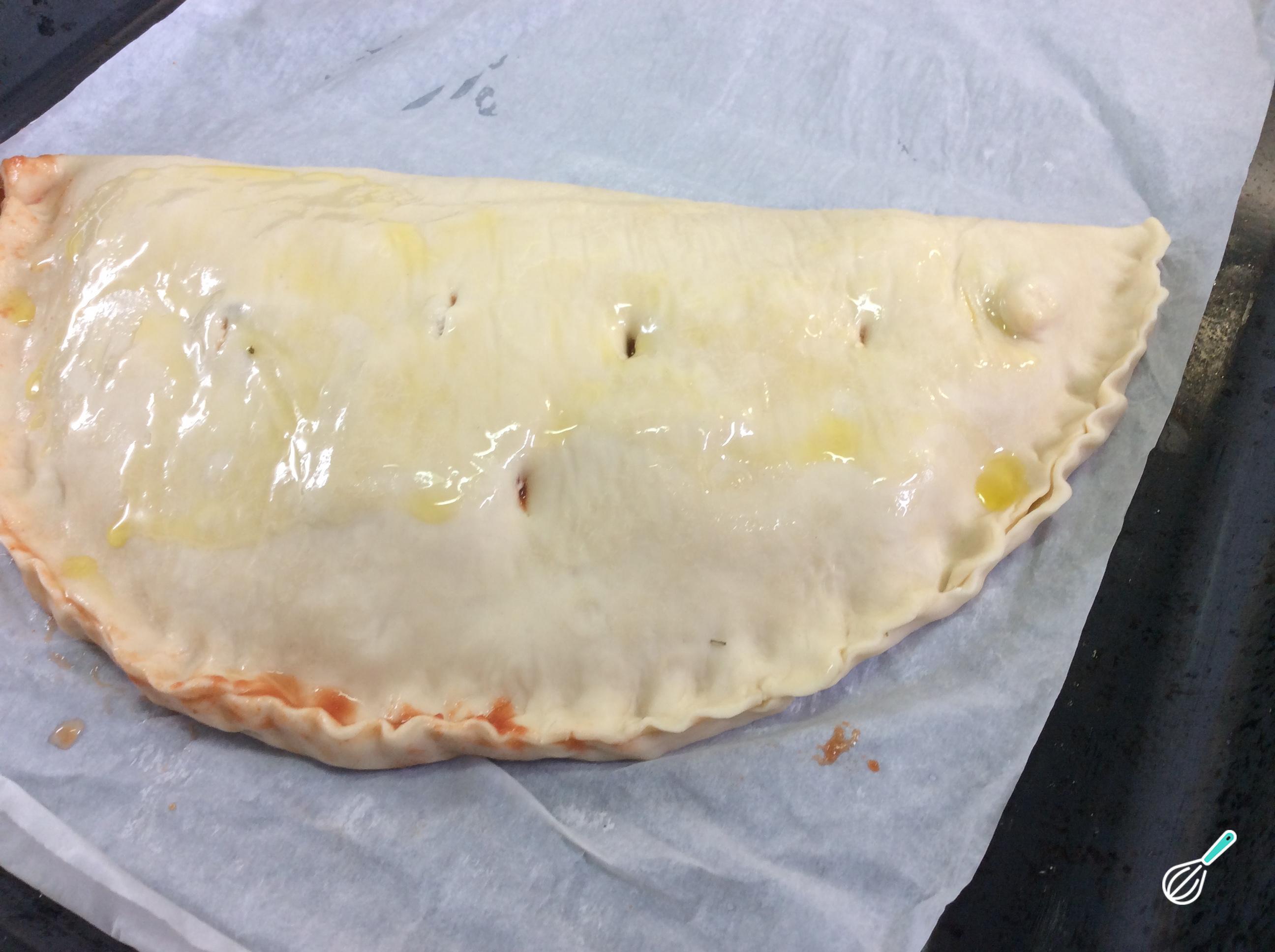 Agora pode fechar o calzone, dobrando a massa de pizza sobre si mesma. Com os dedos, una as duas metades, de forma a evitar que o recheio saia fora durante a cozedura. Pique a massa com uma faca ou garfo, e pincele com um pouco de azeite ou ovo batido.