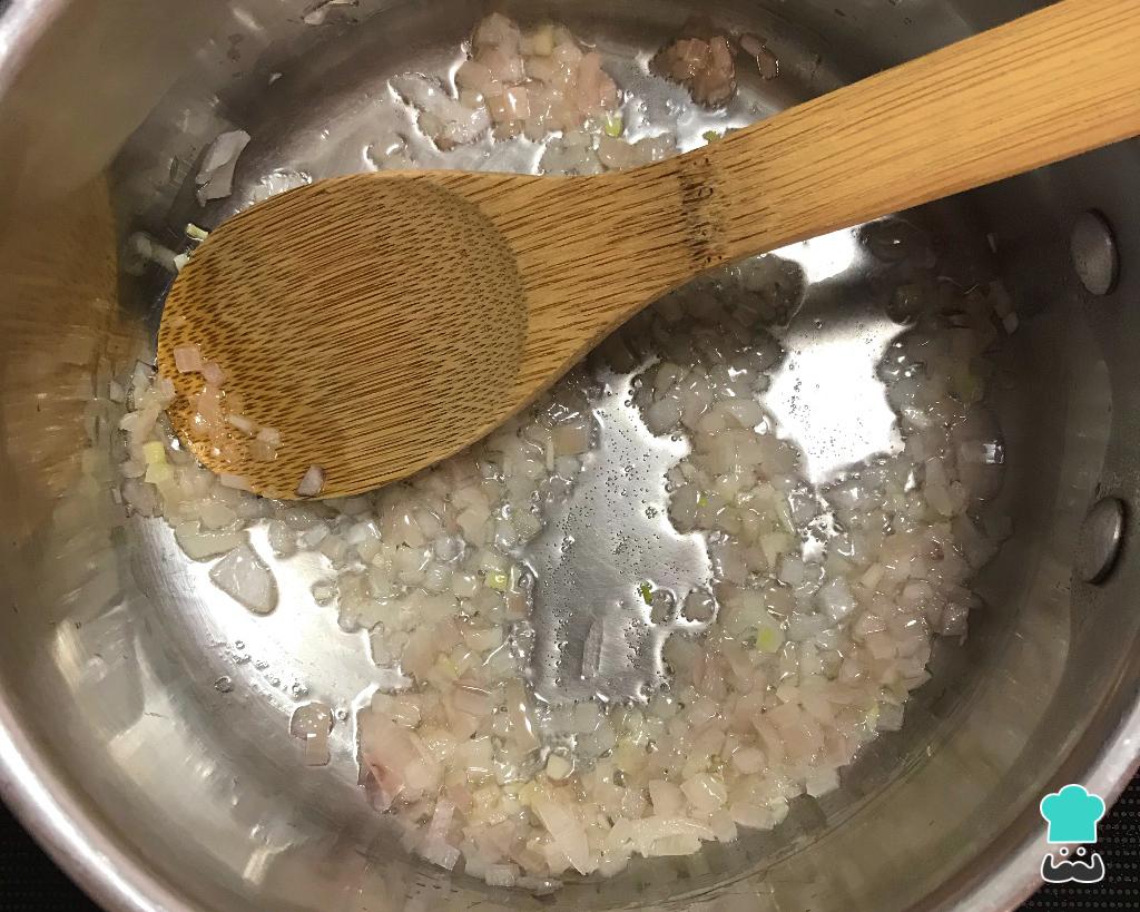 Comece refogando a cebola e o alho no óleo de coco, uns 4 minutos em fogo médio, até a cebola ficar transparente - não deixe torrar a cebola ou seu curry caseiro ficará com gosto amargo.