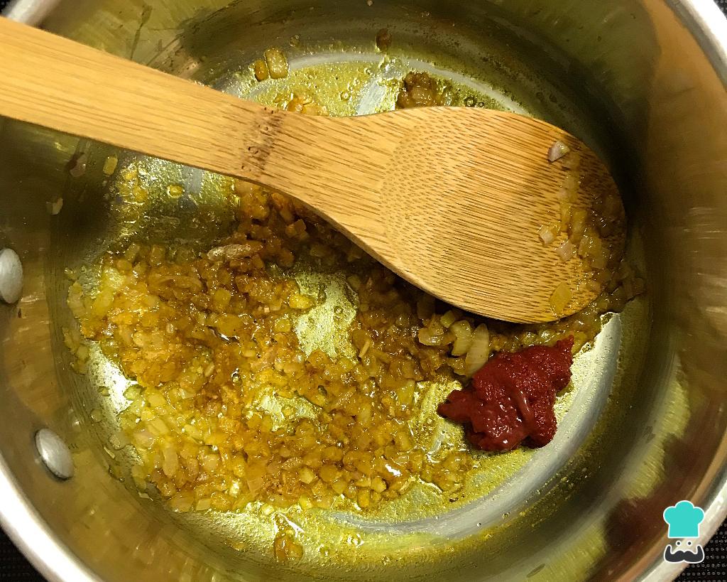 Adicione os temperos (o gengibre ralado, o curry, a páprica, o cominho, a cúrcuma e o sal a gosto) e o tomate em pasta. Refogue por 1 minuto, só até os aromas tomarem conta da sua cozinha.