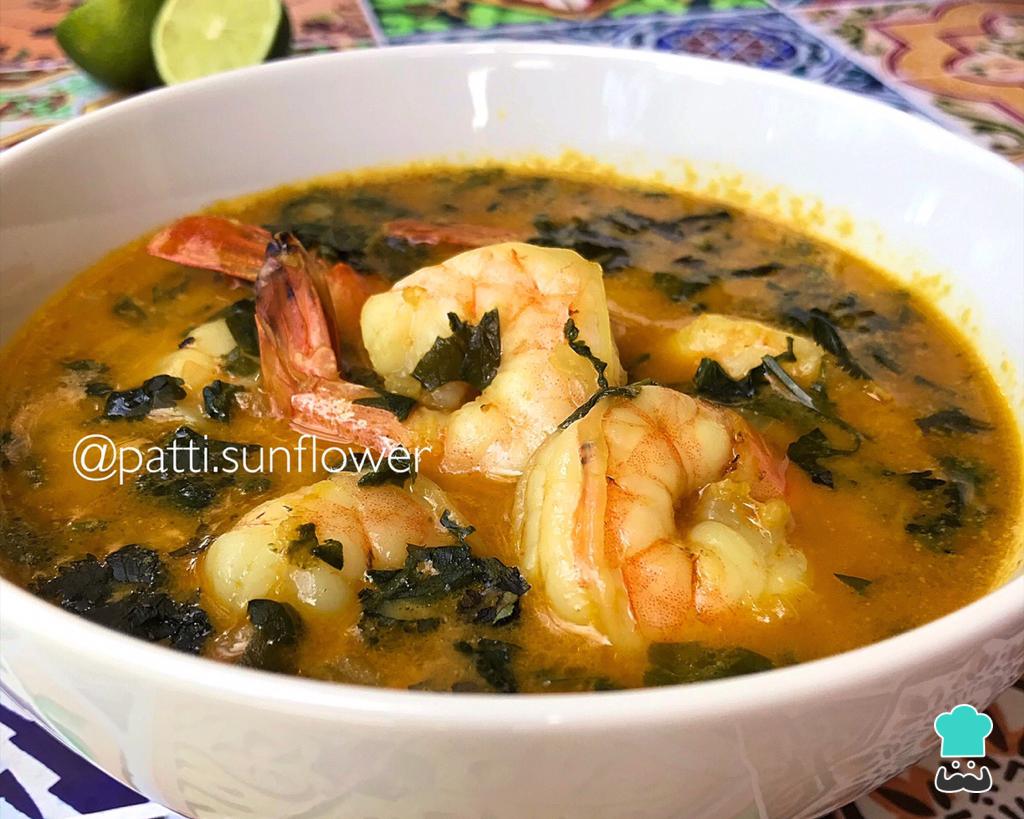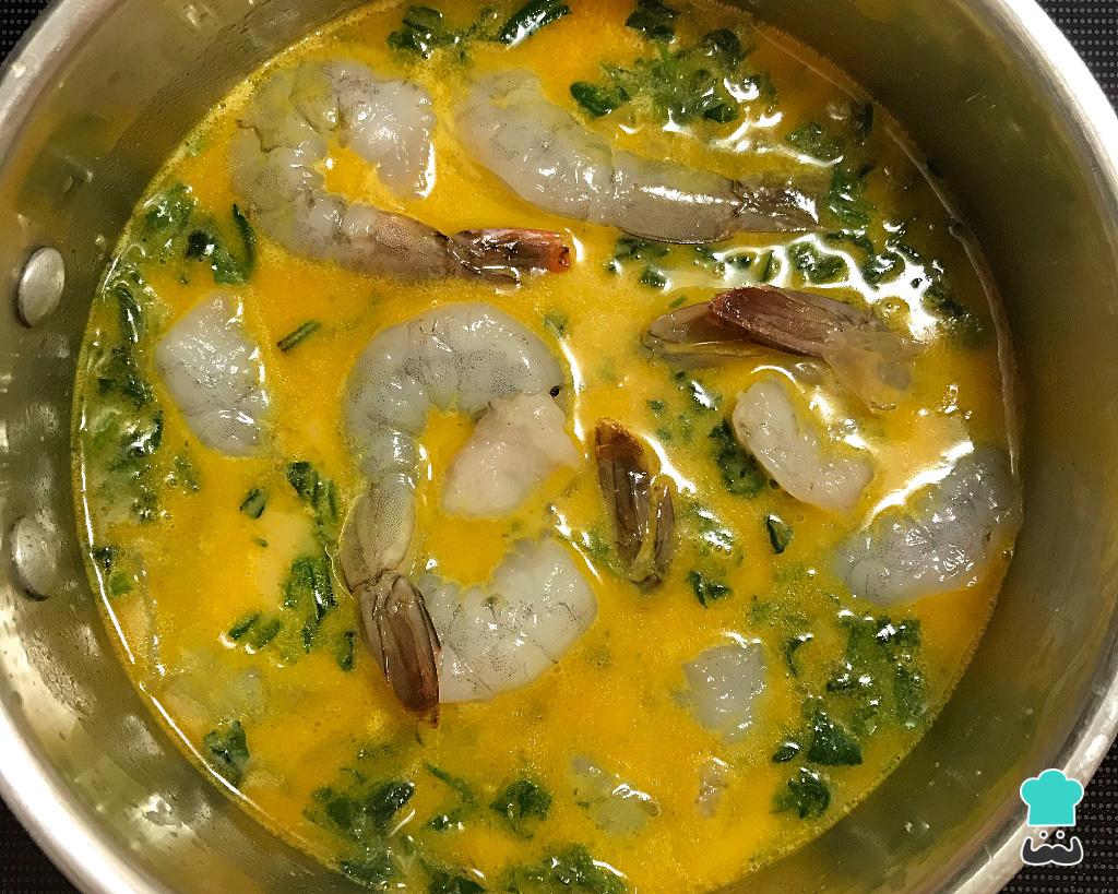 Adicione então o camarão, o espinafre e, se gostar, pode colocar um pouco de coentro (eu gosto). Ferva por 3 minutos, até o camarão mudar de cor e ficar rosado.