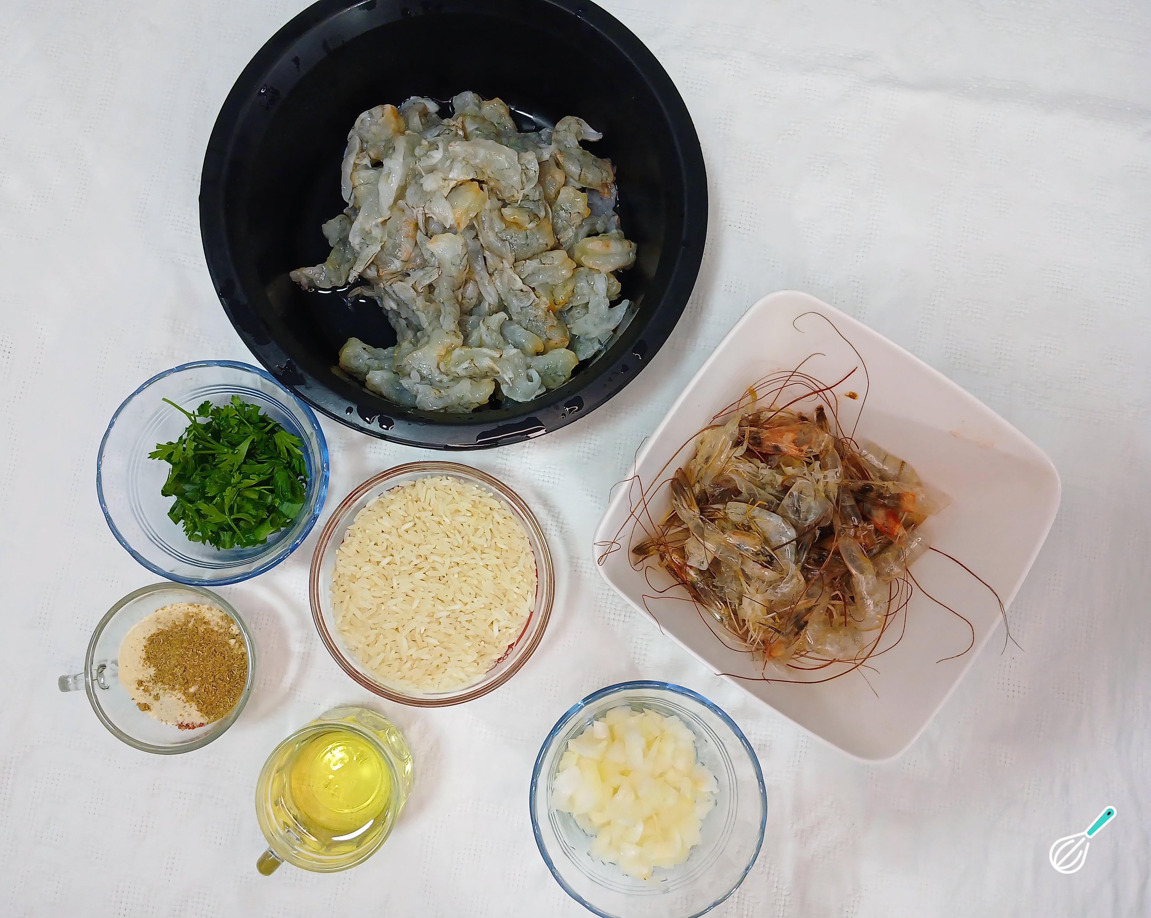 Separe também o óleo de soja, algumas cabeças de camarão, sal, alho e cebola em pó, páprica doce e cominho em pó.