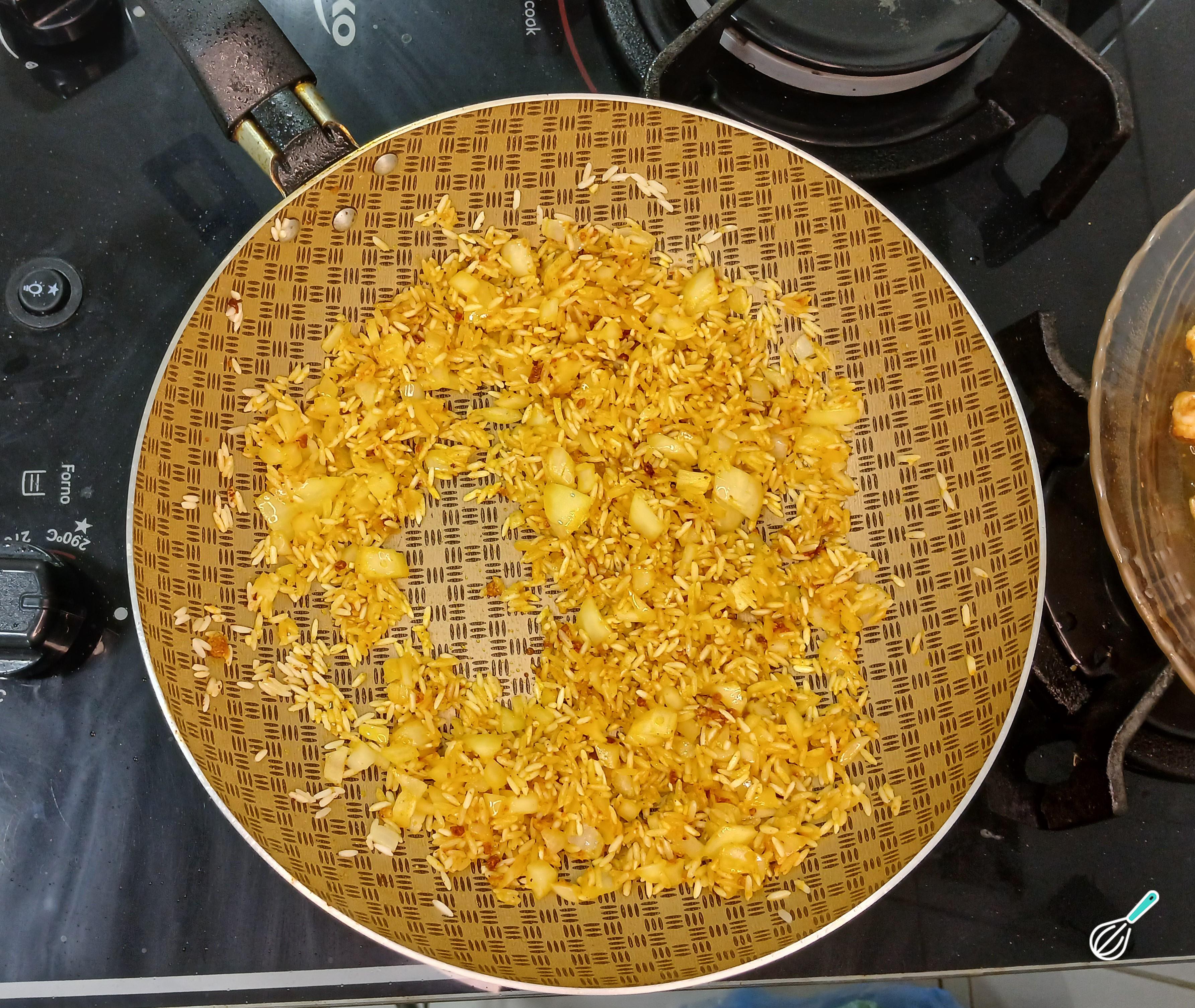 Na mesma panela, adicione a cebola branca cortada, sal e o arroz para refogar. Misture tudo muito bem para que o arroz fique bem refogado.
