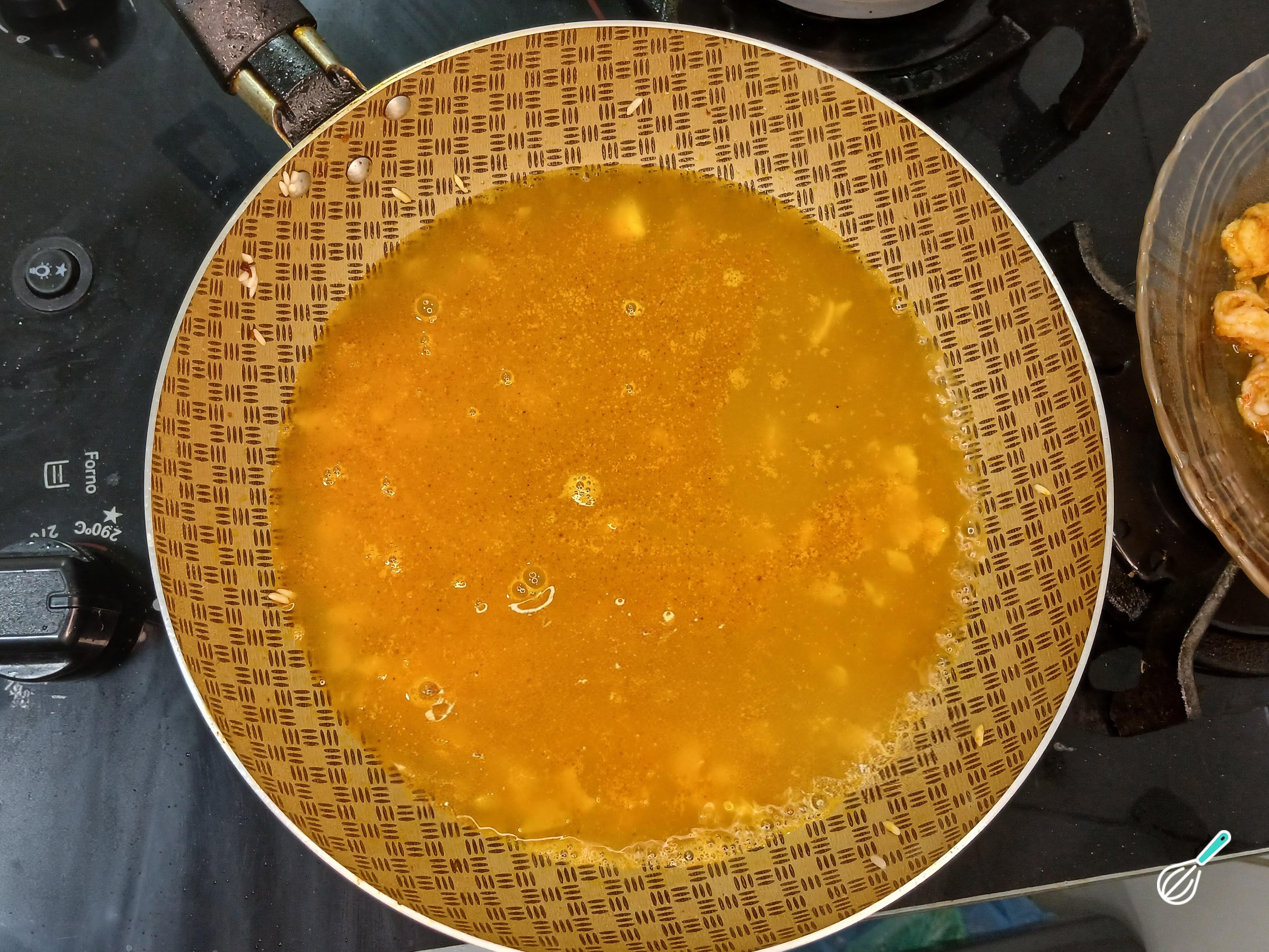Depois de refogado o arroz, cubra-o com o caldo feito com as cabeças dos camarões e deixe que cozinhe. Vá adicionando caldo até cozinhar por completo. Adicione os temperos para cozinharem junto do arroz.
