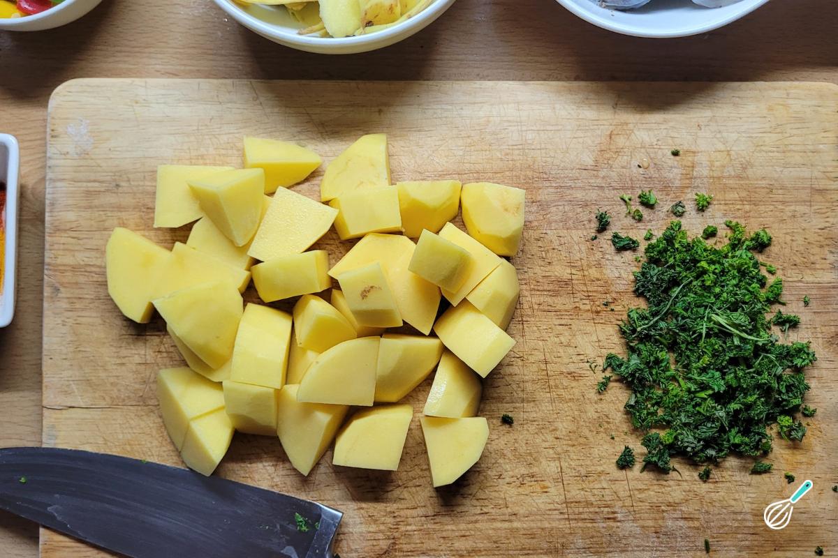 Aproveite para descascar e cortar as batatas em cubos médios e pique também o coentro. Quando tiver dado o tempo dos ovos, passe por água fria, descasque a reserve. Não corte os ovos - nesse preparo, eles são adicionados inteiros ao final.