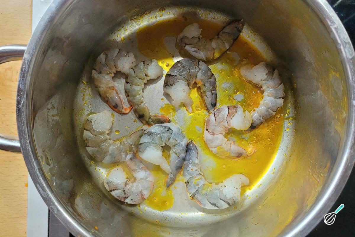 Coloque o restante do azeite de dendê na mesma panela onde fizemos o caldo e adicione os camarões.