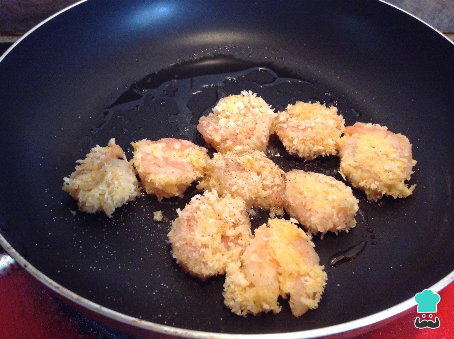 Frite os camarões em uma frigideira com óleo, até que fiquem dourados. Fritar os camarões por emersão é mais rápido, porém mais gorduroso também, por isso optei por fritar com pouco óleo.