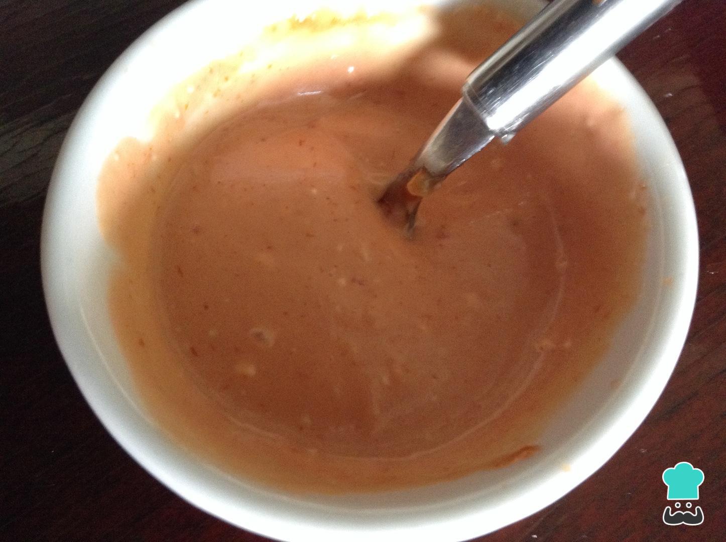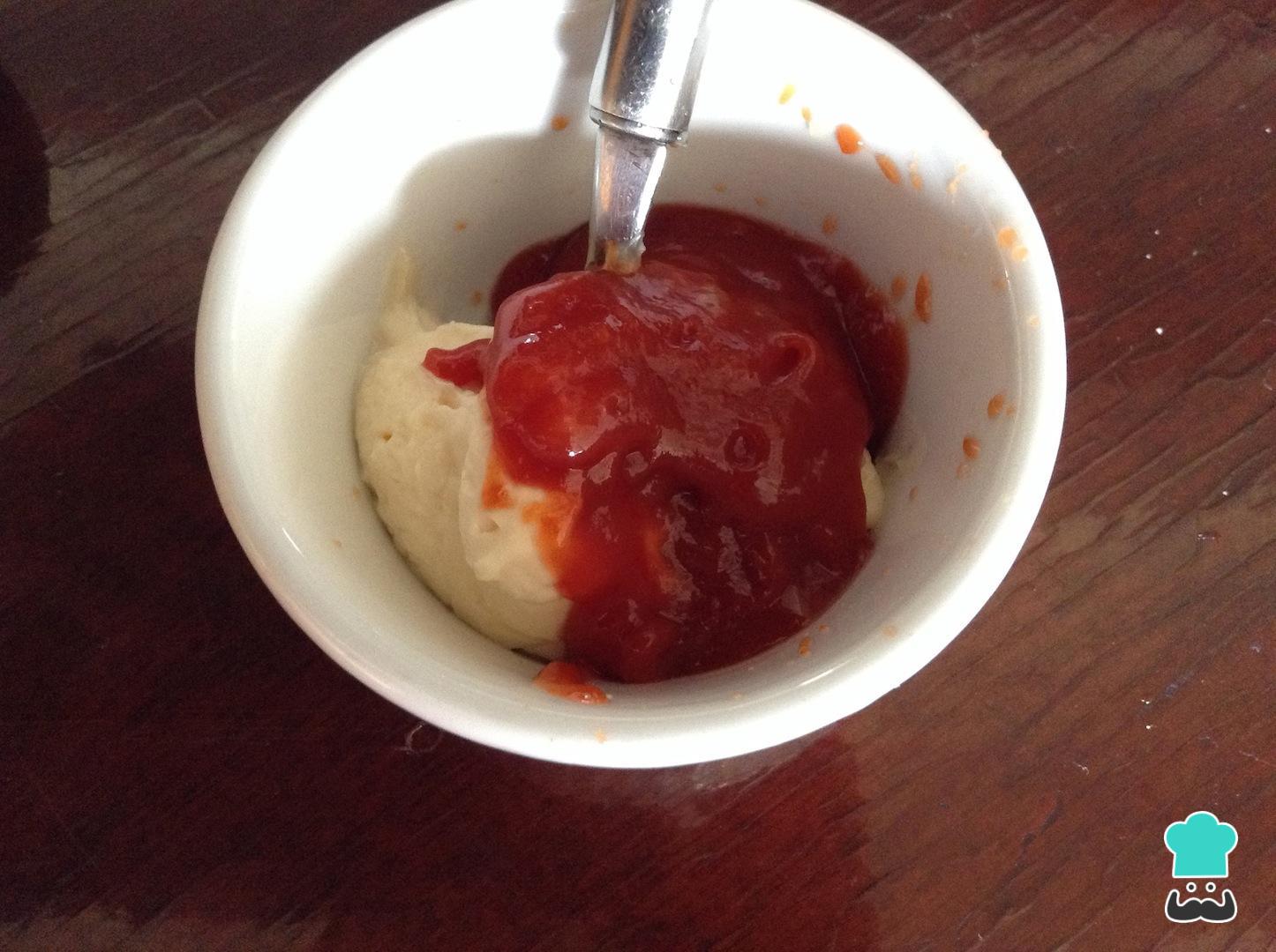 Enquanto os camarões fritam, prepare o molho rosé. É muito simples preparar este molho: comece por misturar o ketchup ou molho de tomate com a maionese.