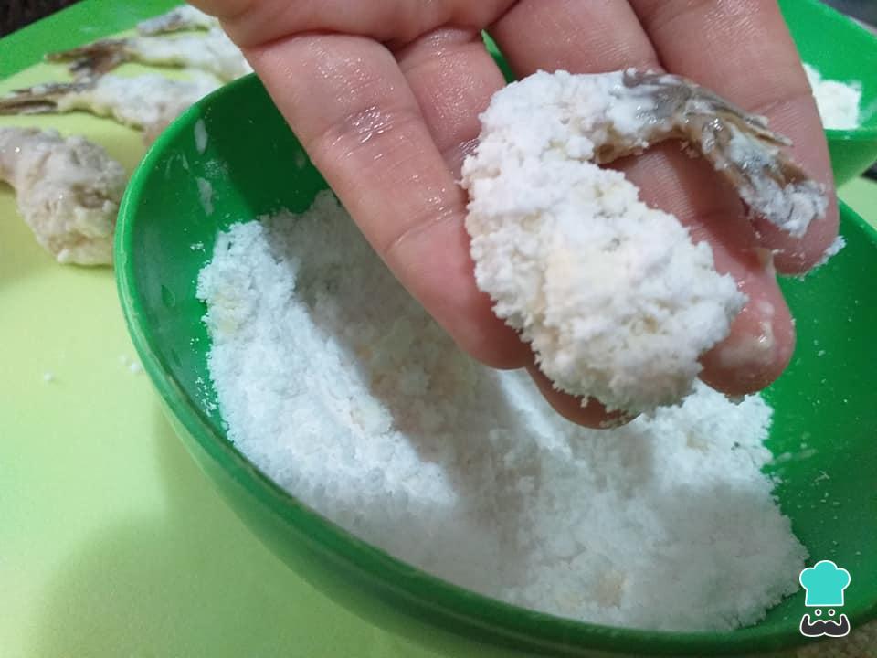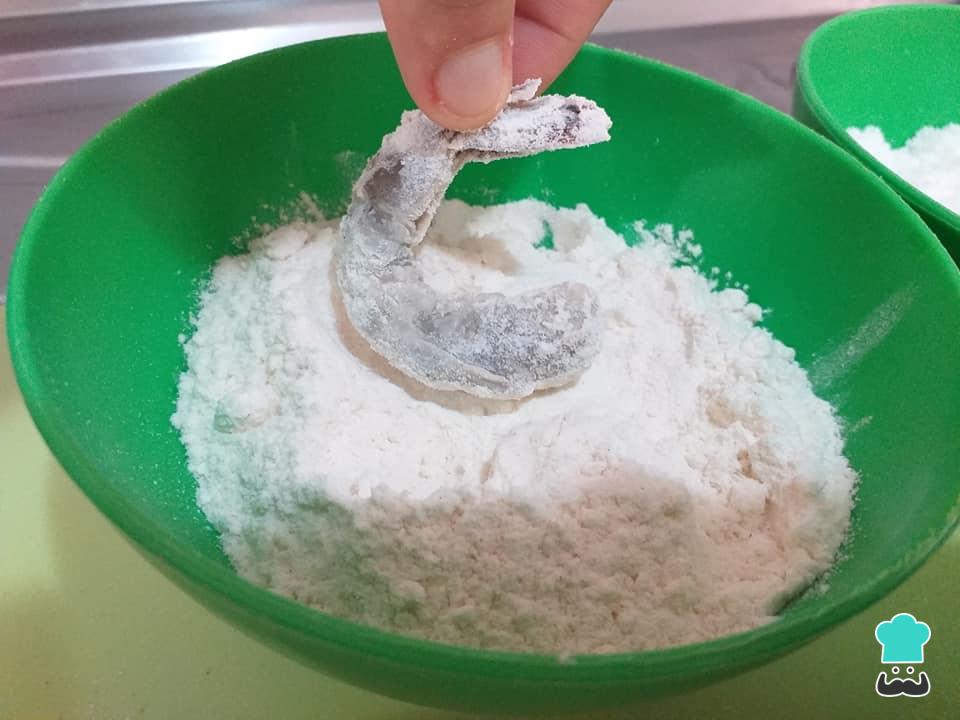 Em seguida passe o camarão na farinha de trigo, depois nos ovos batidos.