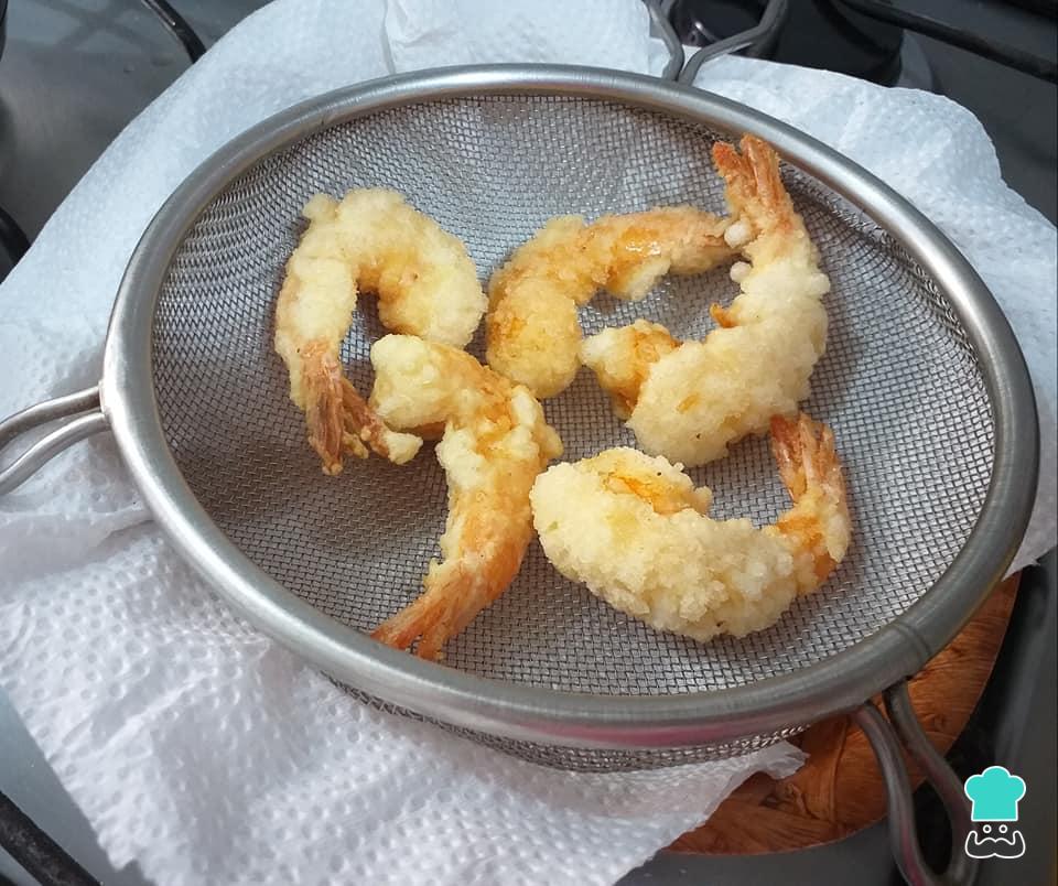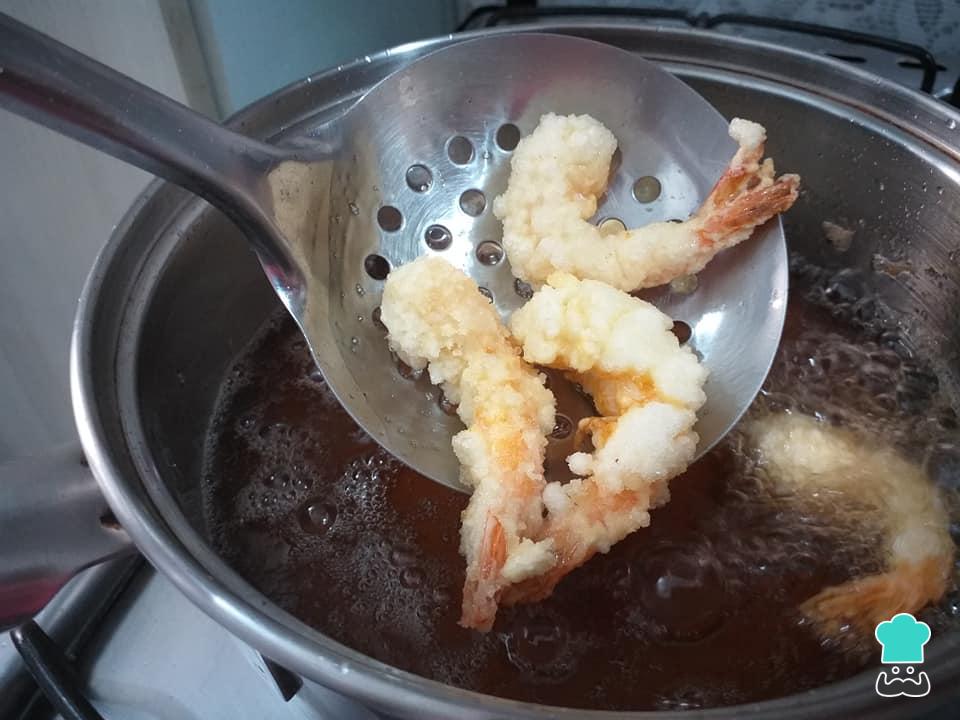 Frite os camarões em óleo quente por aproximadamente 2 minutos e meio - lembre que o camarão não deve cozinhar demasiado, para que não fique com consistência borrachuda.