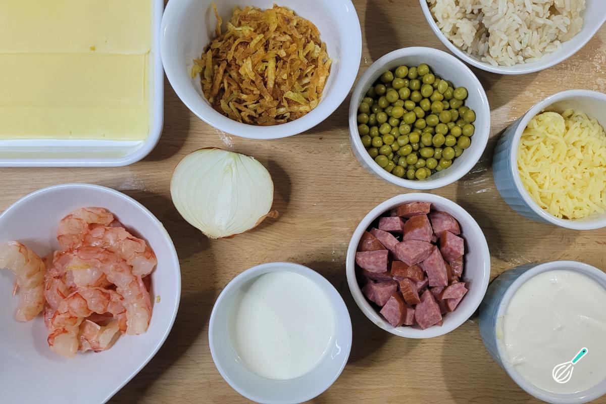 Separe os ingredientes para fazer seu camarão internacional. Normalmente se usa presunto cortado em cubinhos, mas aqui substituímos pela calabresa. Se preferir, pode usar bacon também. Aqui também optei por usar batata palha caseira.