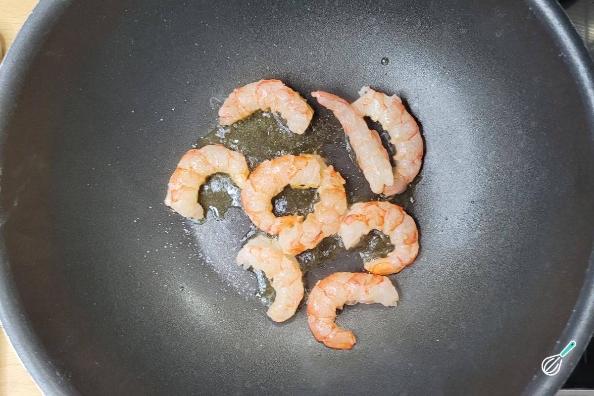 Em uma frigideira grande, coloque azeite e leve os camarões para dourar. Tempere com sal e pimenta do reino.