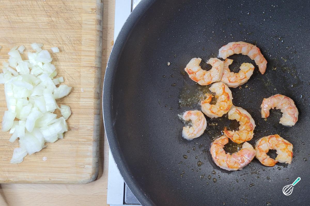Enquanto isso, corte a cebola em cubinhos. O camarão é bem rápido, apenas até dourar, cerca de dois minutinhos de cada lado, para que não passe do ponto e fique borrachudo.