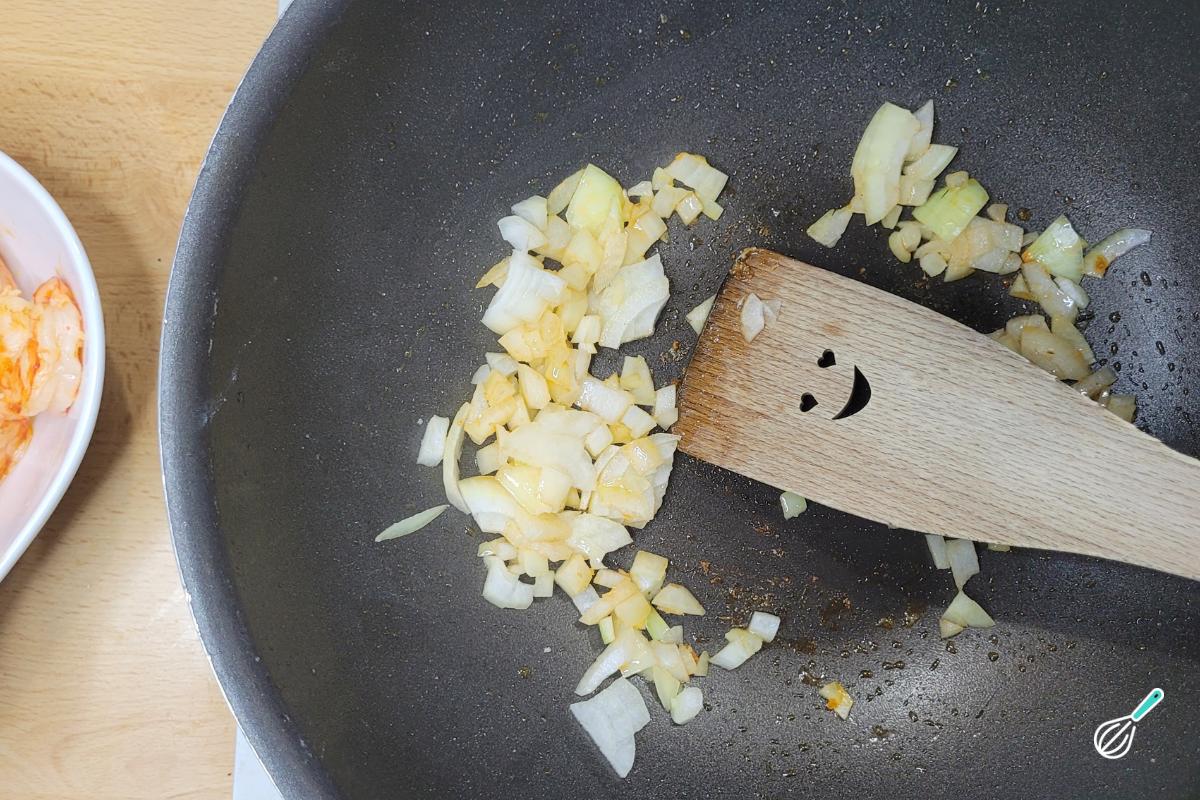 Reserve os camarões e na mesma frigideira coloque a cebola. Se necessário, coloque um pouco mais de azeite e tempere com sal para acelerar o processo.