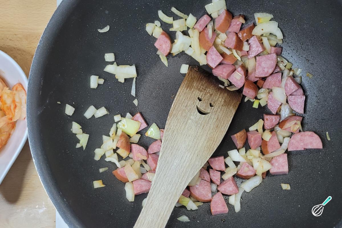 Quando dourar, adicione a calabresa em cubinhos e deixe dourar.