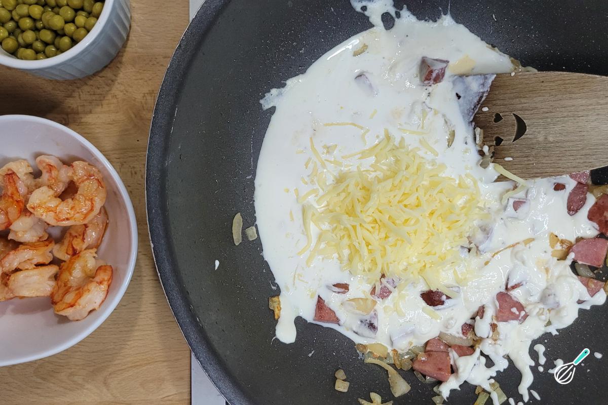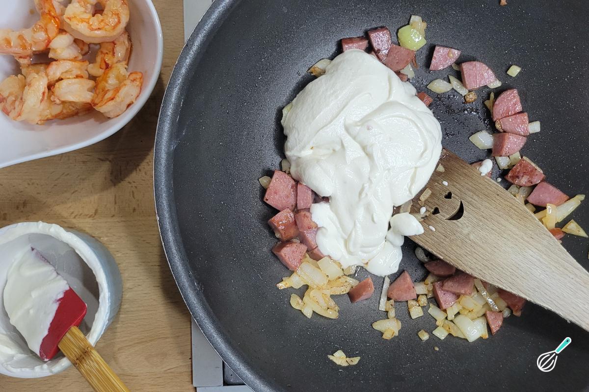 Quando dourar, abaixe o fogo, adicione o requeijão e misture.