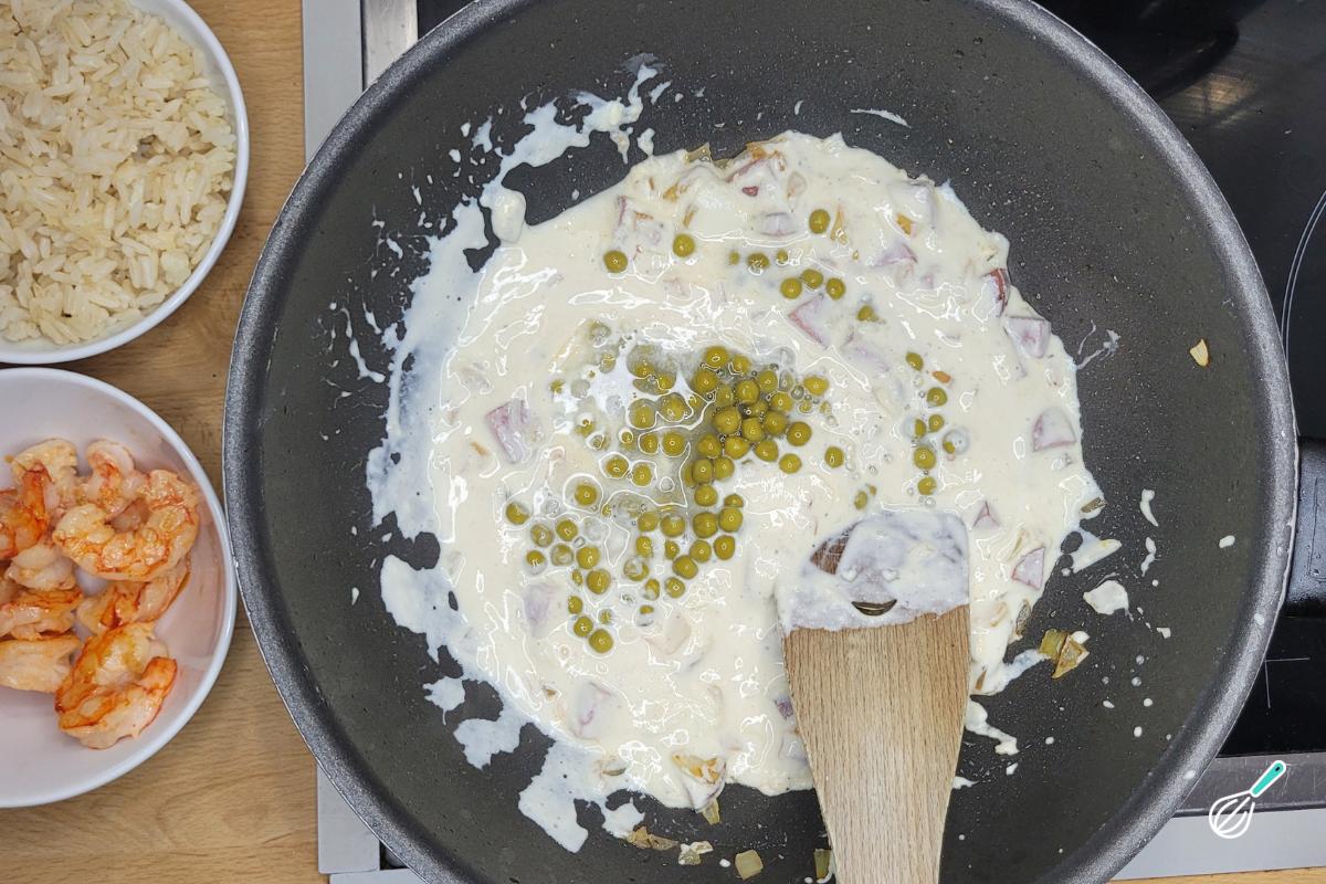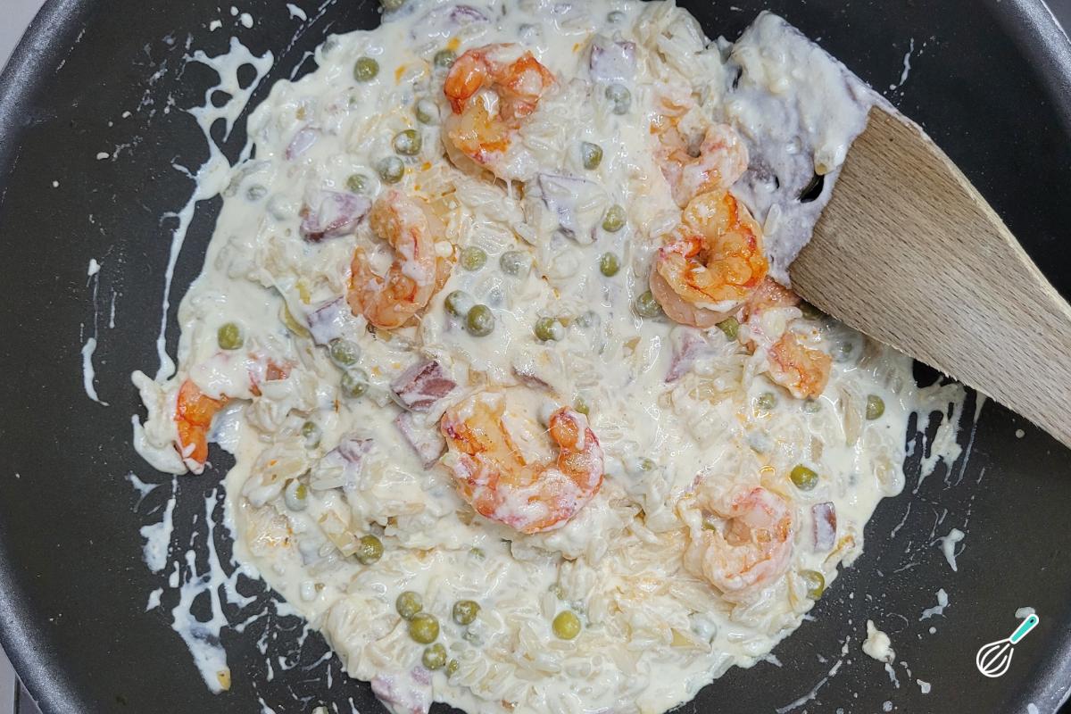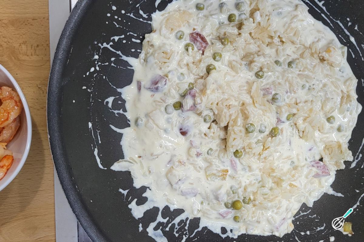 Coloque o arroz cozido, adicione o creme de leite e misture.