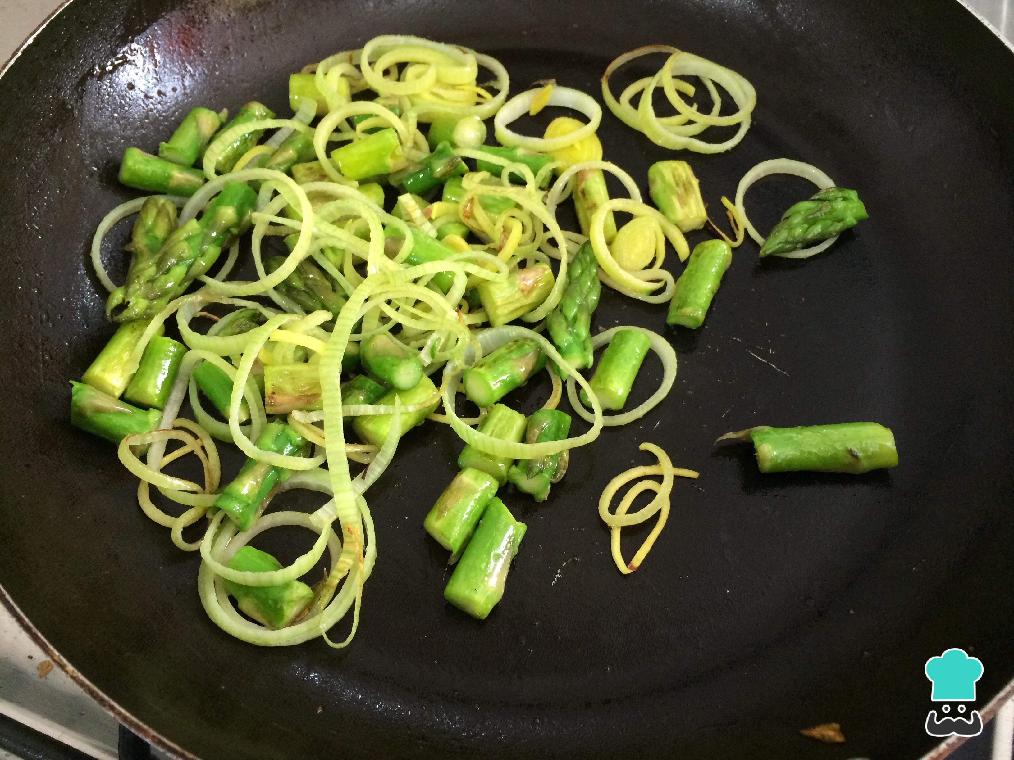 Numa frigideira com o azeite, salteie o alho-poró e os aspargos até ficarem ligeiramente dourados.