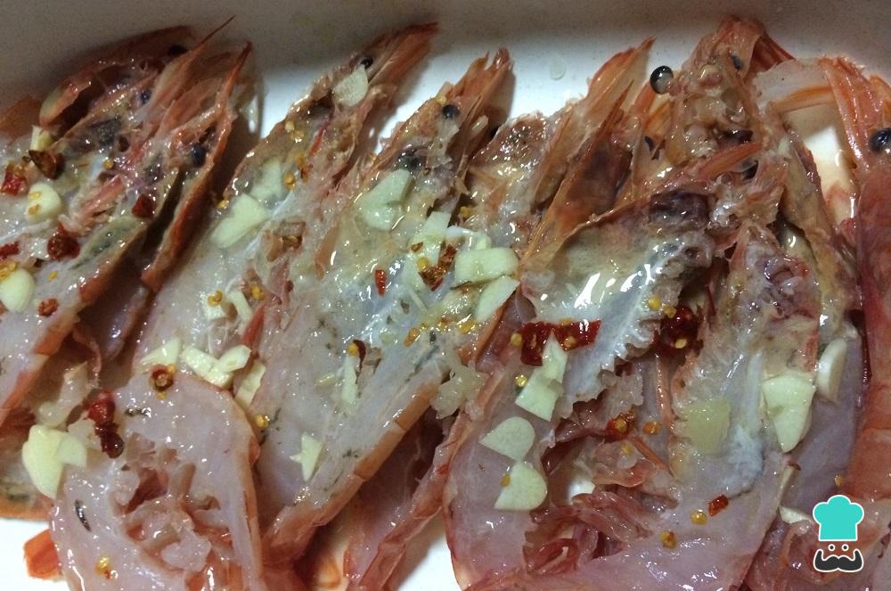 Corte os dentes de alho em lâminas e depois em metades, pique as pimentas calabresas e tempere os camarões em esses dois ingredientes e o suco de limão. Deixe marinar por 30 minutos a 1 hora.