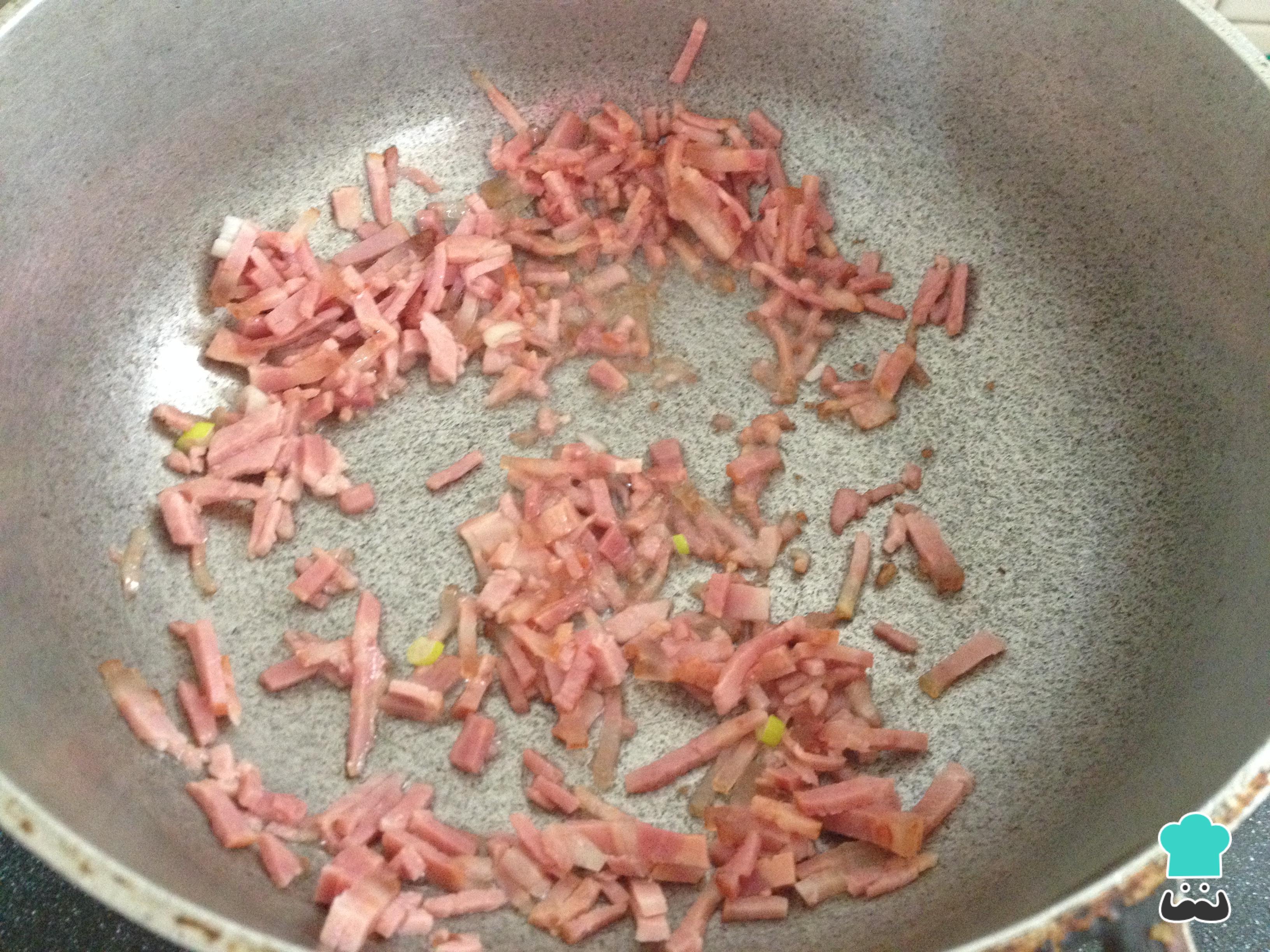 Corte o toucinho em fatias finas, coloque dourando em uma panela com um pouco de azeite por 4 minutos, mexendo sempre.