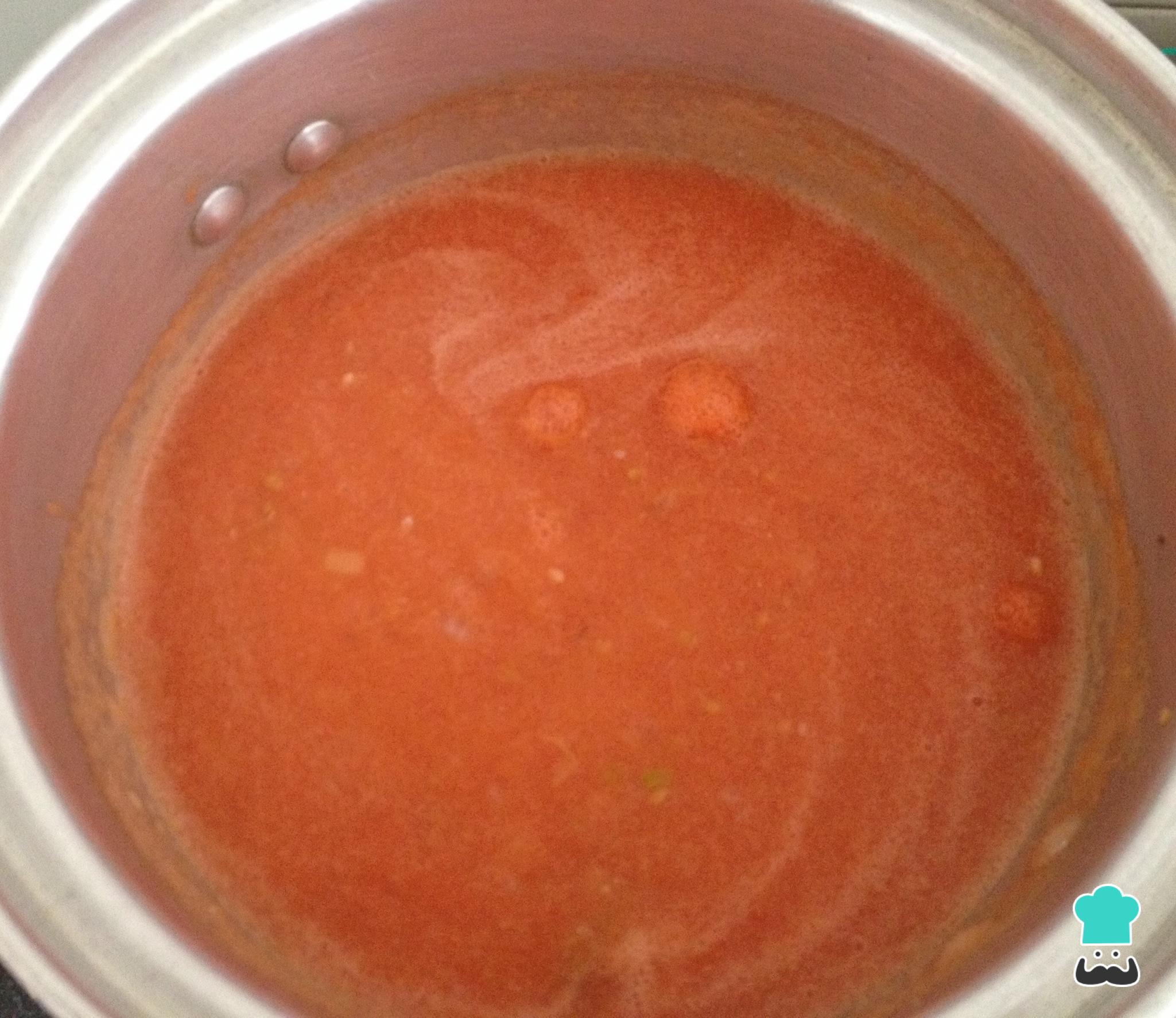 Refogue o alho, a cebola e o alho-poró finamente picados e, quando estiverem transparentes, adicione o purê de tomate e a folha de louro. Cozinhe por 20 minutos e tempere com sal e pimenta.