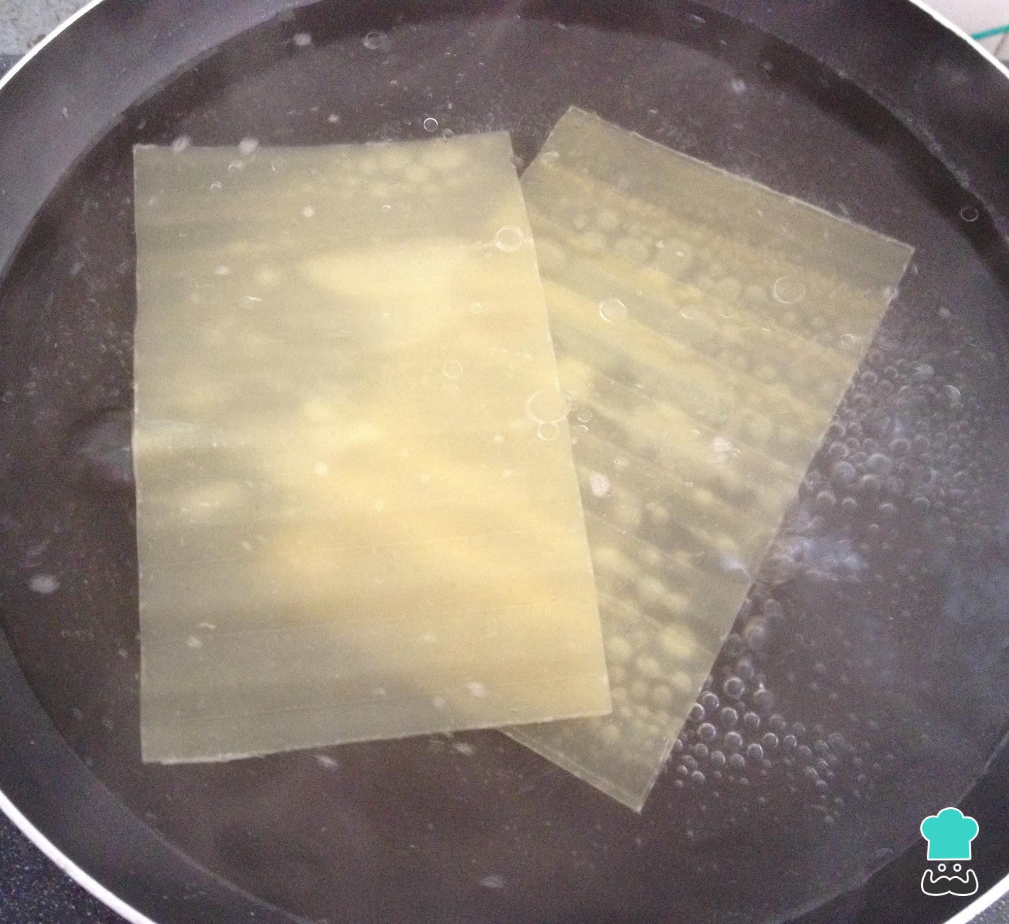Em uma frigideira com água fervente cozinhe o macarrão de lasanha durante 1 minuto, para que o possa modelar facilmente.