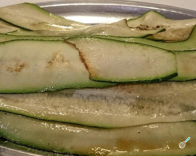 Comece por lavar as abobrinhas e cortar em fatias bem finas, quase transparentes. Doure as fatias dos dois lados numa grelha ou frigideira levemente untada com azeite e reserve.